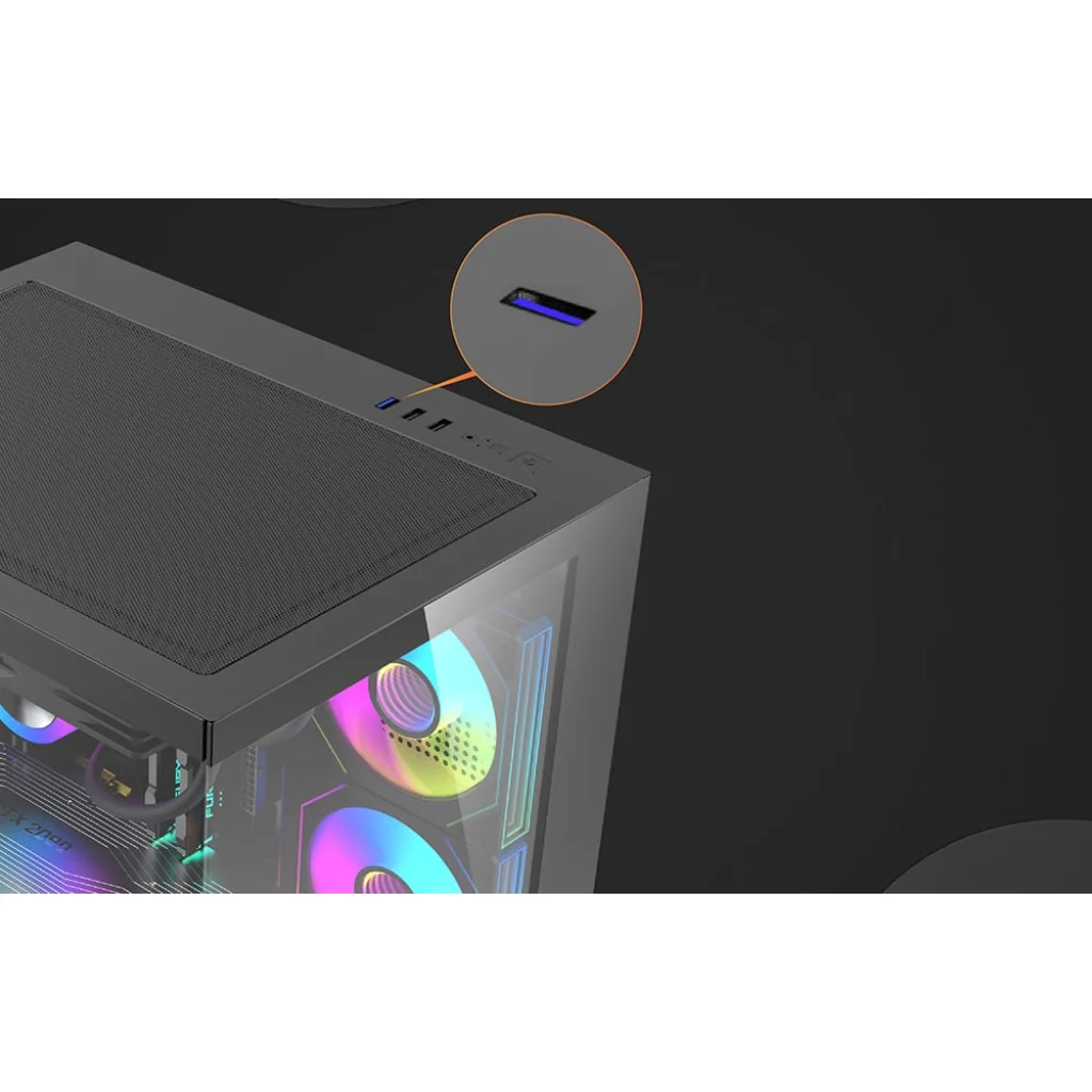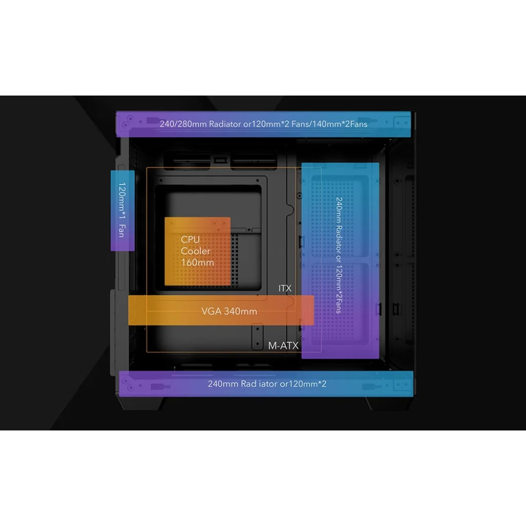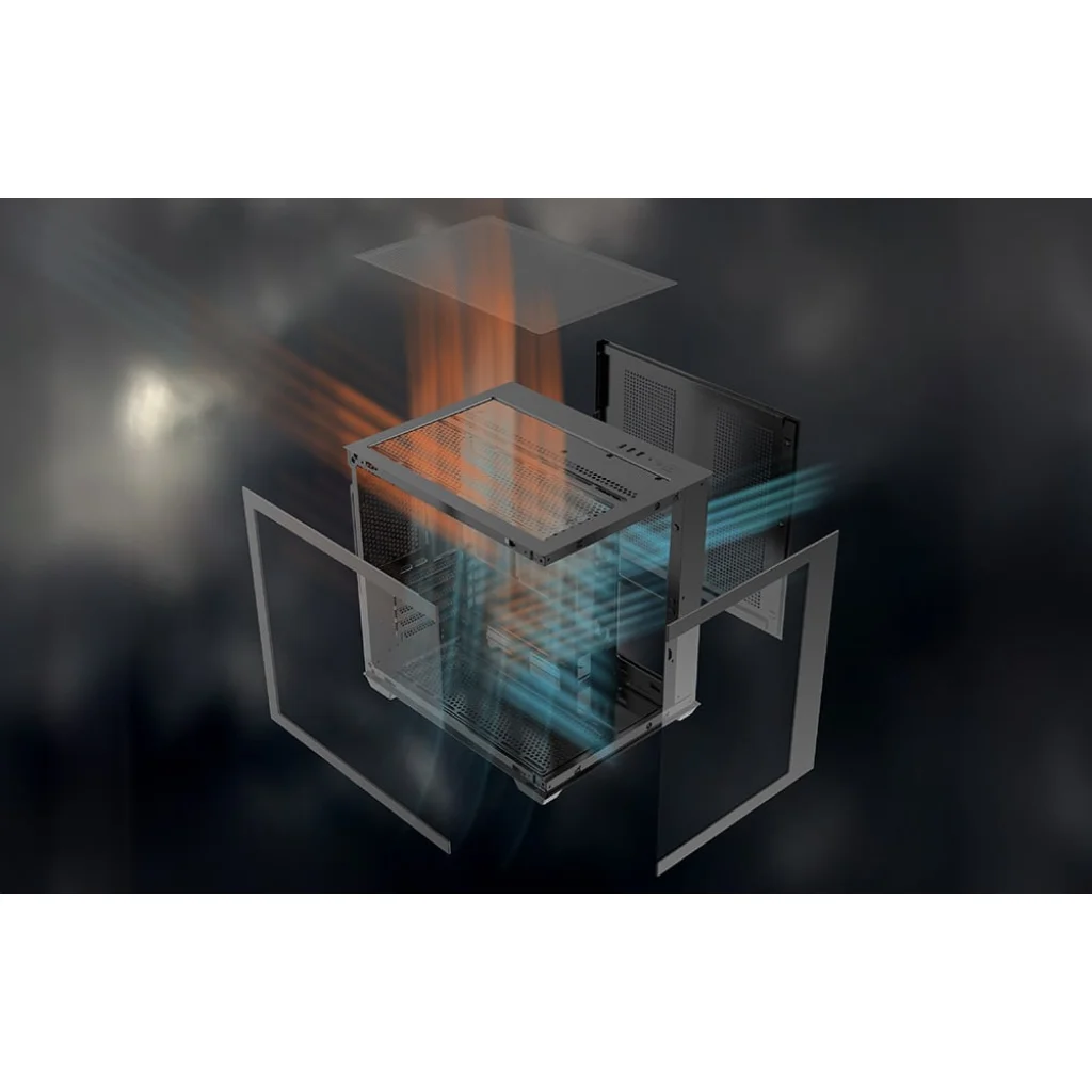 A DarkFlash B275 egy kompakt számítógépház, amelyet M-ATX vagy ITX alaplapra épülő modern rendszerekhez terveztek. A két átlátszó panelnek és a függőleges sarokprofil nélküli kialakításnak köszönhetően 270°-os panorámás betekintést biztosít, így a belső tér teljes egészében jól látható. Ez a modell maximum 340 mm hosszú videokártyákat és legfeljebb 160 mm magas CPU-hűtőket támogat, így kompakt méretben is nagy teljesítményű konfiguráció építhető.
