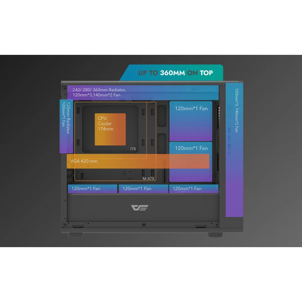 Kivételes hűtési teljesítmény A Darkflash DB460M akár 12 darab 120 mm-es vagy 4 darab 140 mm-es ventilátor telepítését is lehetővé teszi, ami kiváló hőelvezetést jelent a PC belsejéből. A ház támogatja a vízhűtés beépítését is - akár 360 mm hosszú hűtőbordát is felszerelhet, így ideális választás a nagy hőteljesítményt igénylő rendszerekhez.