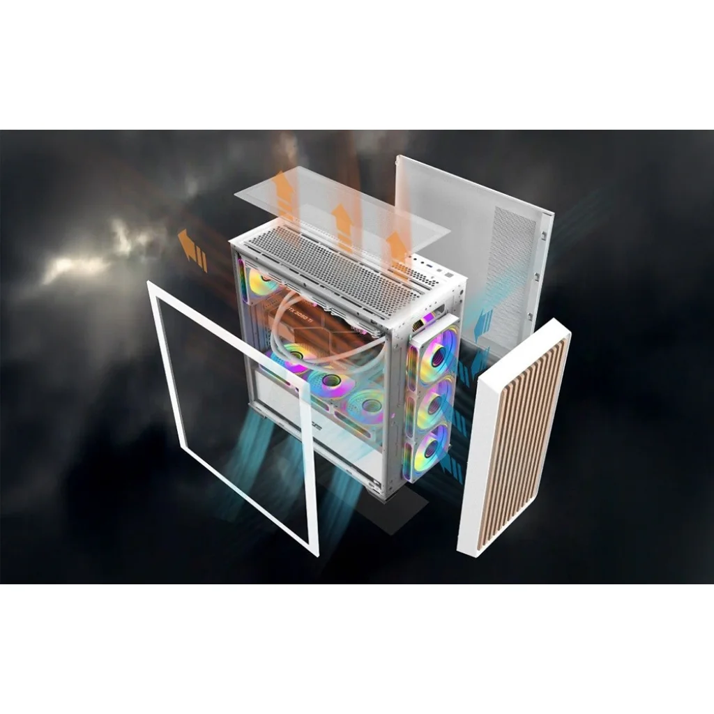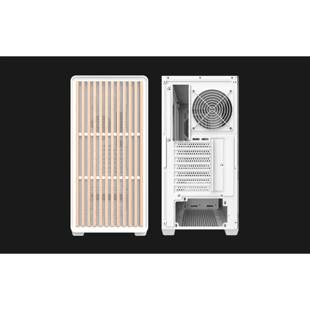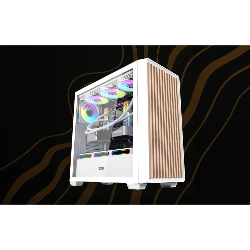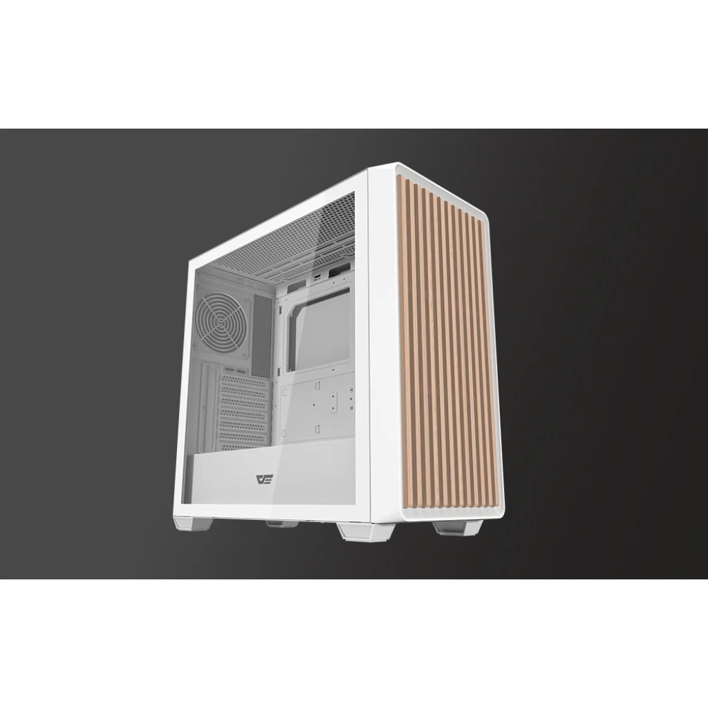 A Darkflash DS900WD egy olyan számítógépház, amelyet olyan felhasználók számára terveztek, akik praktikus megoldásokat keresnek. Az edzett üveg oldallap és a fa előlap jó láthatóságot biztosít az alkatrészek számára, és az egész háznak egyedi megjelenést kölcsönöz. Lehetővé teszi ATX, M-ATX és ITX formátumú alaplapok beépítését, így nagy rugalmasságot biztosít számítógépe építése során. Tágas kialakításának és többféle rögzítési lehetőségének köszönhetően kényelmes készletösszeszerelést és jó légáramlást biztosít.