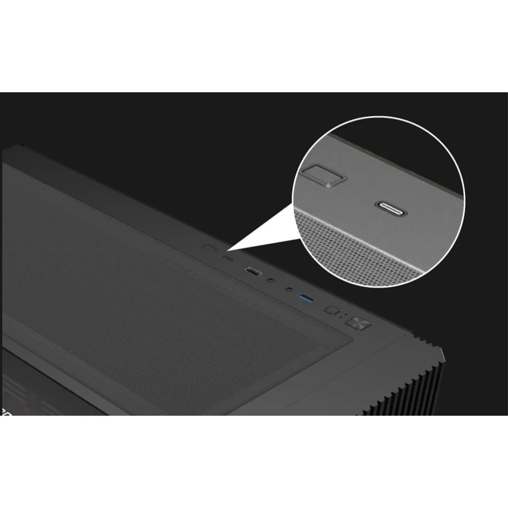 A ház 0,5 mm vastag SPCC acélból készült, amely stabilitást és ellenállóságot biztosít. Mérete 470 x 218 x 454 mm, így kompakt, mégis tágas kialakítású. A belső elrendezés megkönnyíti az alkatrészek beszerelését és a kábelmenedzsmentet, ami jobb légáramlást és rendezettebb megjelenést eredményez. A jobb oldali panel részben fémhálós kialakítású, amely segíti a szellőzést és védi az alkatrészeket a portól. A felső és alsó hálós panelek tovább fokozzák a légáramlást, mágneses kialakításuk pedig gyors eltávolítást és visszahelyezést tesz lehetővé.