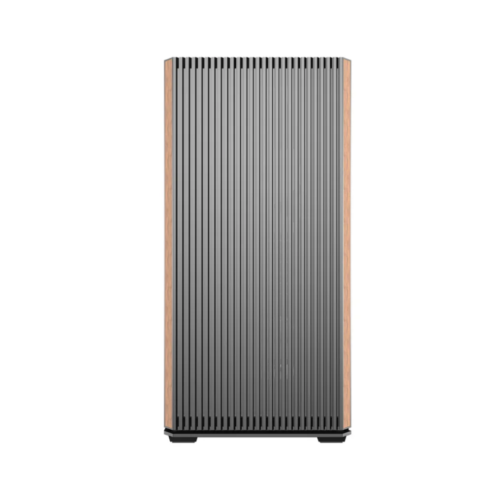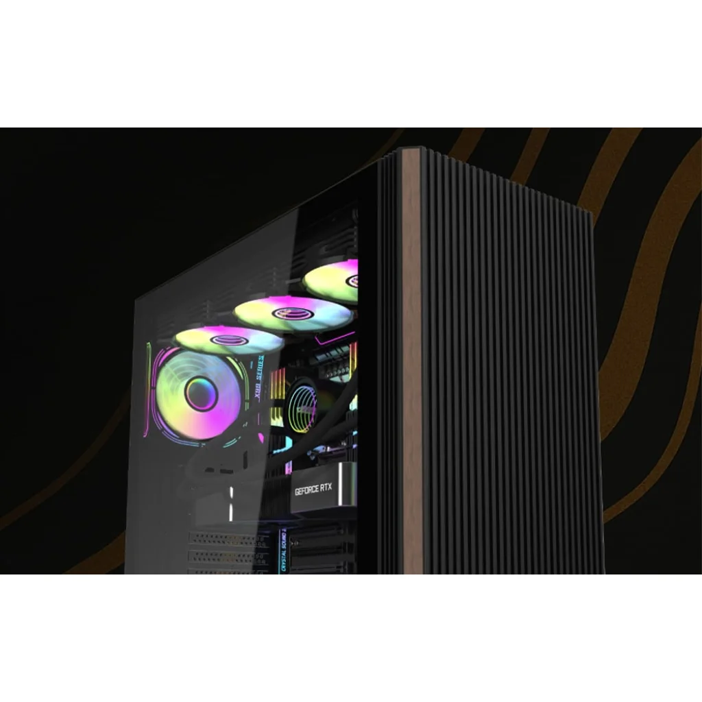 A bal oldali edzett üvegpanel lehetővé teszi a számítógép belsejének megtekintését, beleértve a ventilátorok világítását és az alkatrészeket is. Az előlapon található fa hatású díszítés elegáns és egyedi megjelenést kölcsönöz a háznak.