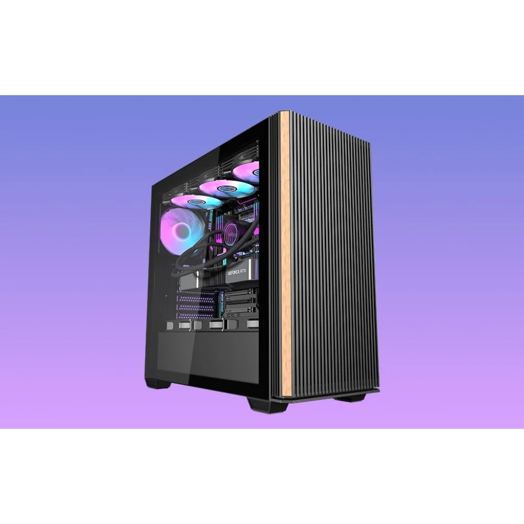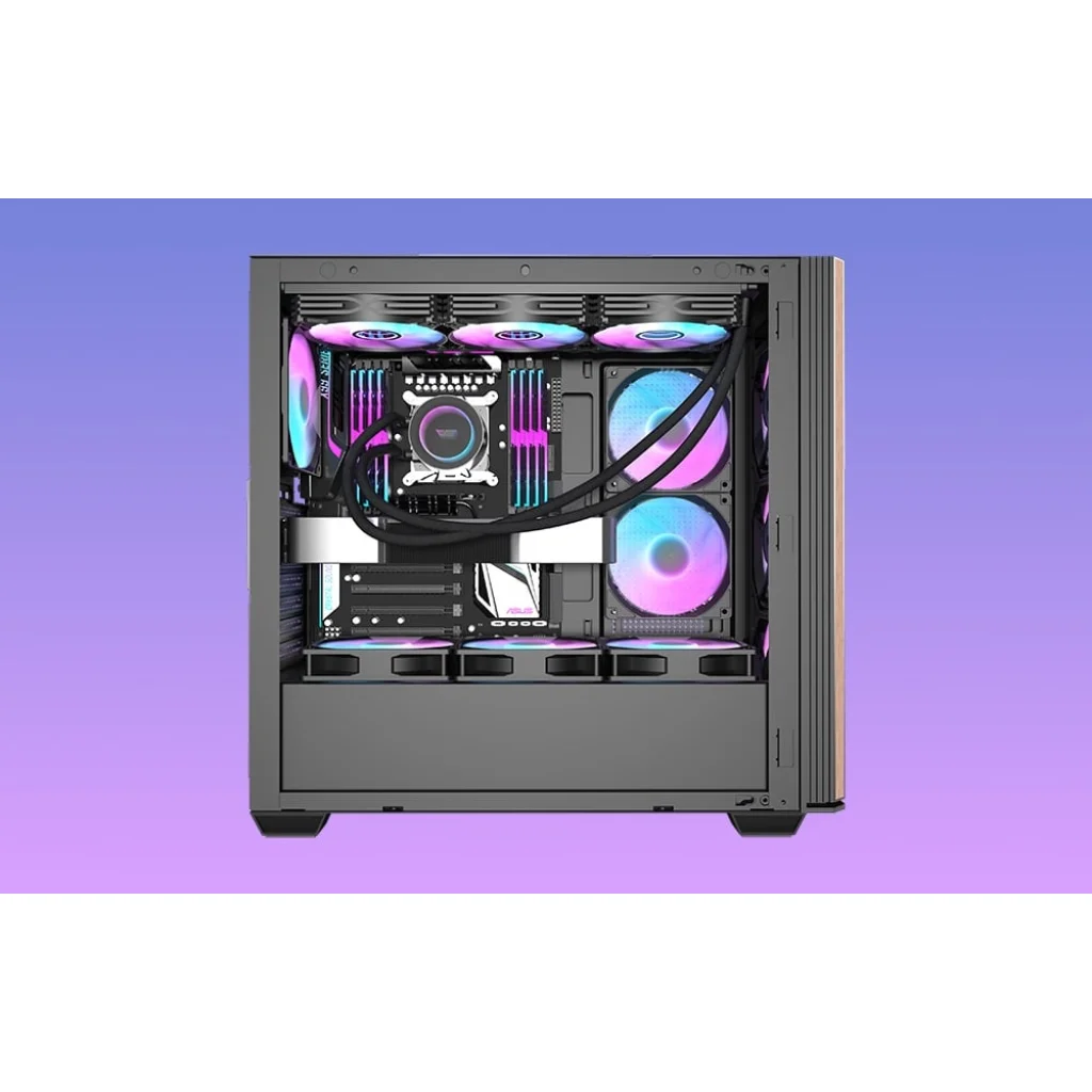 A Darkflash DS900WS egy modern megoldás az igényes felhasználók számára, akiknek fontos az esztétika és a funkcionalitás. Az egyetlen átlátszó üvegfallal, valamint fa és fém előlappal ellátott, A-oszlop nélküli panoráma kialakítású, jellegzetes dizájn nemcsak lenyűgözően néz ki, hanem az alkatrészek kiváló láthatóságát is biztosítja. A házat úgy tervezték, hogy optimális hűtést, teljesítményt és sokoldalúságot biztosítson, miközben könnyű módosítást és a számítógépes rendszerek bővítését kínálja. A készlet 4 ventilátort tartalmaz.