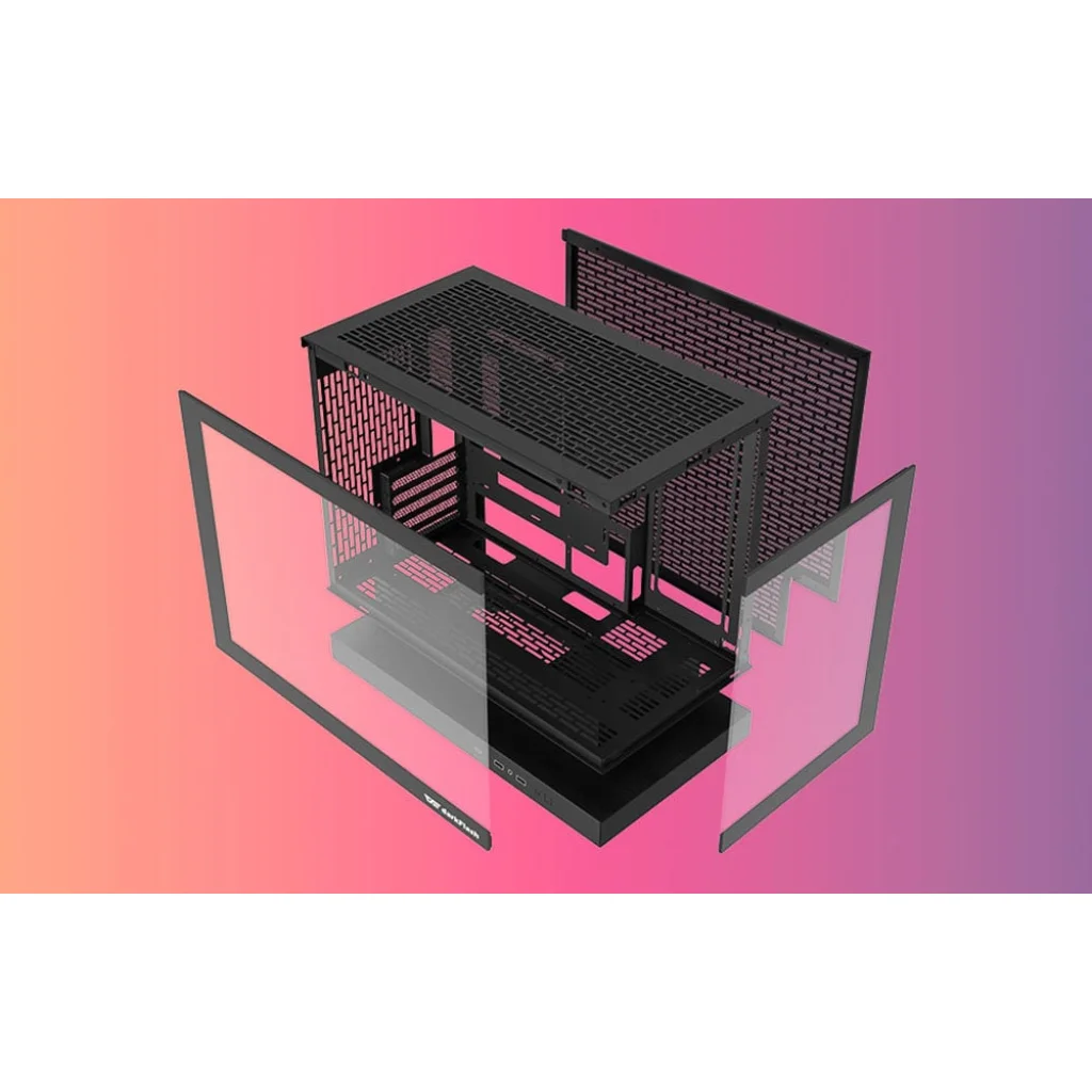 A ház kiváló minőségű, 0,8 mm vastagságú SPCC acélból készült, amely garantálja a tartósságot és a stabilitást. Emellett edzett üveglapok teszik láthatóvá a belső teret, és az egész egység rendkívül modernnek tűnik - ez a megoldás remekül mutat a játékosok asztalán és azon túl is.