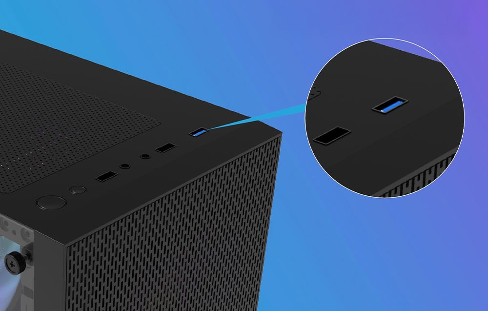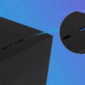 A ház felső szélén a be- és kimenetek intuitív panelje található, köztük egy fejlett USB 3.0 csatlakozó. Ez lehetővé teszi a gyors fájlátvitelt és a mobileszközök kényelmes töltését. A portok felső elhelyezkedése lehetővé teszi a kényelmes használatot, függetlenül attól, hogy a számítógép hol áll - az asztalon vagy az asztal alatt.