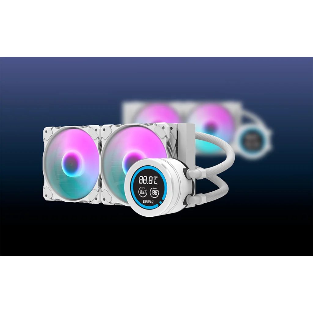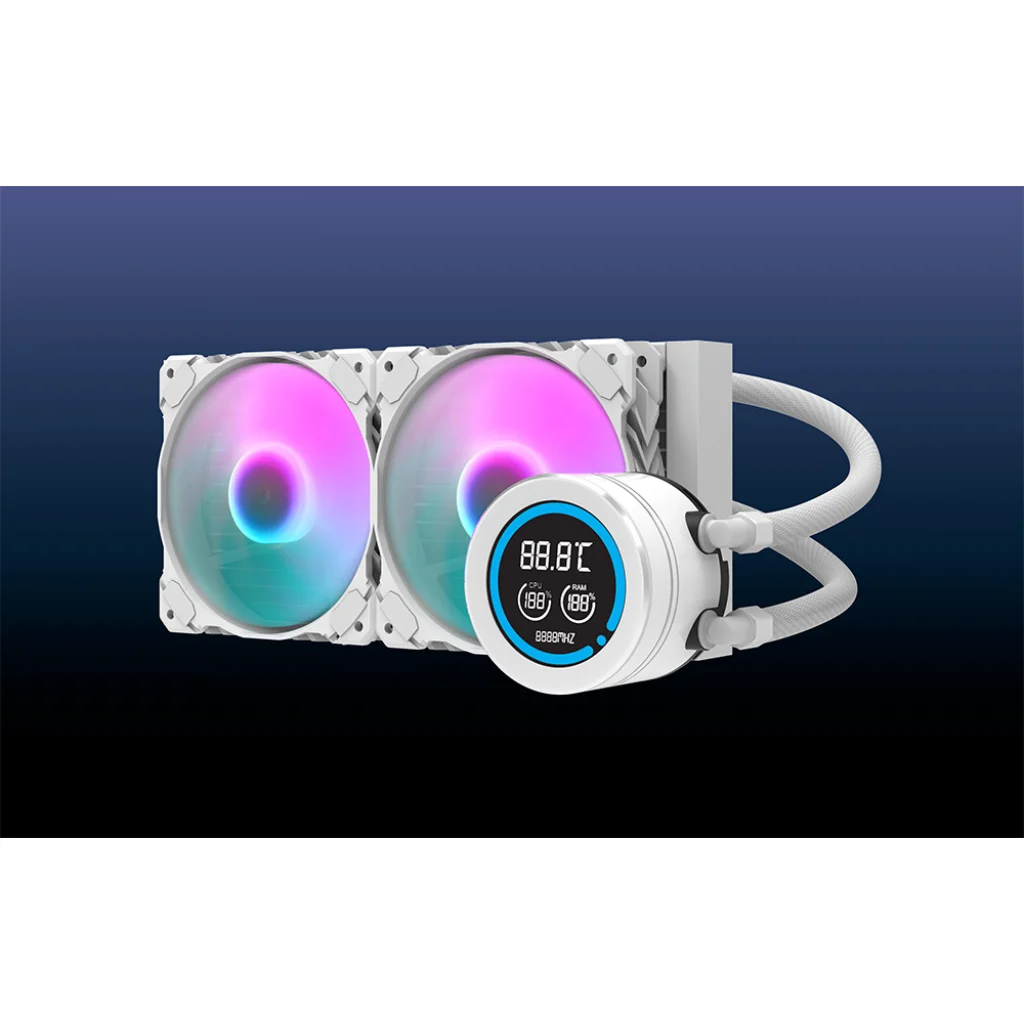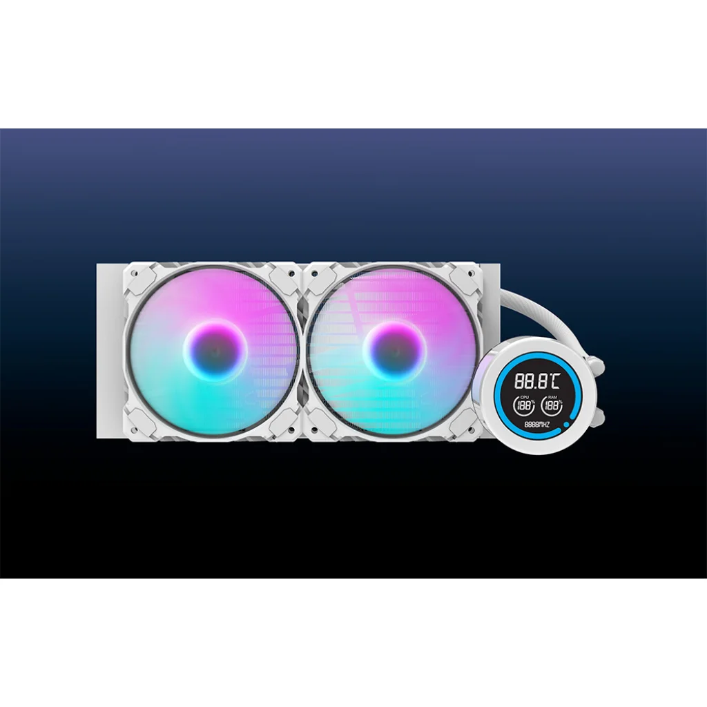 A Darkflash DN-D240 egy nagy teljesítményű 240 mm-es vízhűtő, amely stabil CPU működést biztosít alacsony hőmérsékleten. Réz vizesblokkal és alumínium hűtőbordával rendelkezik a hő hatékony elvezetése érdekében, ami elengedhetetlen, ha a rendszer erősen terhelt. A kettős 120 mm-es, hidraulikus csapágyazású, PWM vezérléssel és ARGB háttérvilágítással ellátott ventilátorok optimális légáramlást és csendes működést garantálnak. Az LCD-kijelzőn nyomon követheti a CPU és a RAM hőmérsékletét, az IIR+EPDM csövek pedig magas hőmérséklet-állóságot és a kialakítás tartósságát biztosítják.