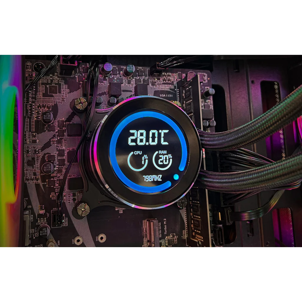 A vizesblokk 2,1 hüvelykes LCD-kijelzővel rendelkezik, amely 480x480 px felbontást és 16,7 millió színt kínál. Információkat szolgáltat a processzor (CPU), a RAM és a szivattyú fordulatszámáról, így a paraméterek közvetlenül a hűtőn követhetők nyomon. Ez megkönnyíti, hogy a rendszert az Ön igényeihez igazítsa.