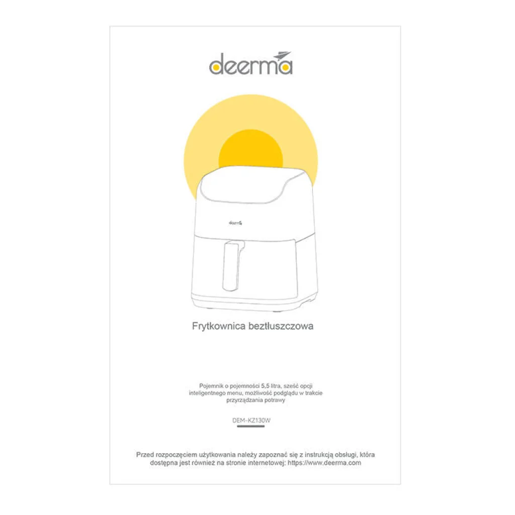 A Deerma DEM-KZ130W egy 1300 W-os légfritőz, amely keringtetett forró levegőt használ zárt térben, hogy finom ételeket készítsen Önnek. Az Ön biztonsága érdekében a készülék dinamikus NTC hőmérséklet-szabályozással és égési sérüléseket védő fogantyúval van felszerelve, így még élvezetesebb a használata. Ezenkívül a légfritőzön vannak gombok a hőmérséklet változtatására, a sütés késleltetési idejének beállítására, a menü kiválasztására, valamint a be- és kikapcsolásra.