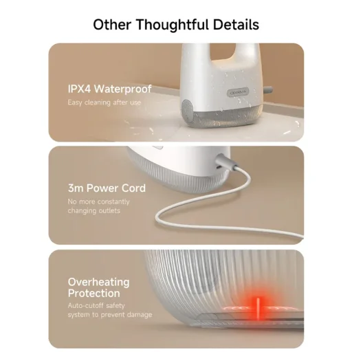 - Egy erős 1300W-os motorral felszerelve a készülék eléri a 100°C-os hőmérsékletet, és mindössze 20 másodperc alatt használatra kész.