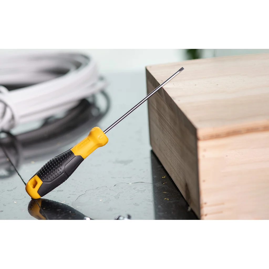 Kényelmesen használható, strapabíró, 3x100 mm -es laposfejű csavarhúzó sárga színben. A termék fogantyúja kiváló minőségű műanyagból készült. Praktikus lyukkal rendelkezik, amely lehetővé teszi a szerszám felakasztását, például egy szerszámtáblára. A csavarhúzó mágneses csúccsal is fel van szerelve, ami nagyban megkönnyíti a munkáját.