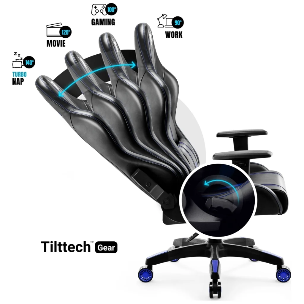 A fekete szék kék részletekkel kiváló választás azok számára, akik értékelik a stílust, a kényelmet és az ergonómiát — tökéletesen illeszkedik egy modern gamer környezetbe, egy ifjúsági szobába vagy egy otthoni irodába.