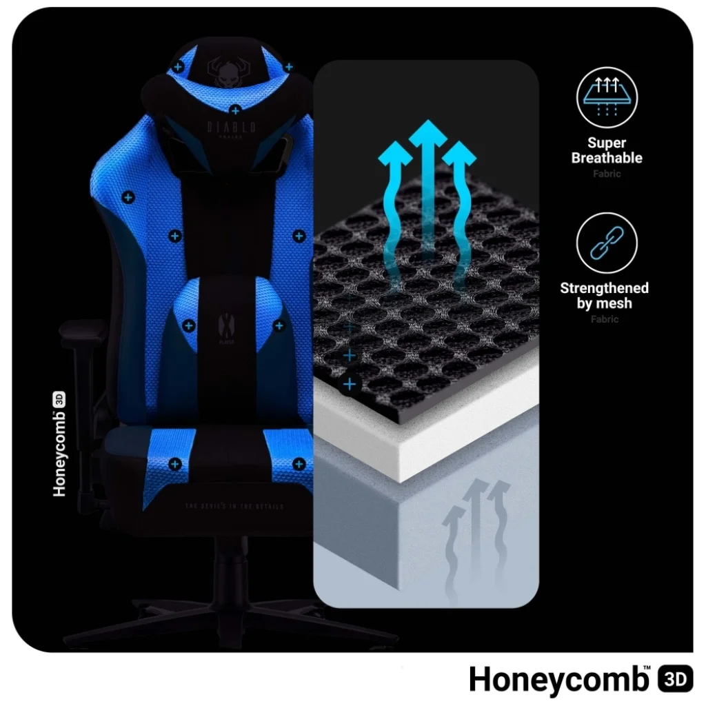 Az ergonomikus kialakítás segíti a megfelelő testtartást a kontúros háttámla, fejtámla és deréktámaszpárna révén, csökkentve a hát- és nyakfájdalmakat még hosszú időtartamú használat során is. A kényelmes, széles ülés HR habréteggel puha, mégis stabil támaszt biztosít, míg a magas minőségű EcoFiber™ anyag és légáteresztő Diablo Honeycomb™ háló biztosítja a megfelelő légáramlást és a tartós kárpitot.