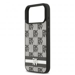 A DKNY PU bőr kockás minta és csíkos prémium hátlap elegáns és jellegzetes mintázattal rendelkezik, melyet egy fémes DKNY logó egészít ki.