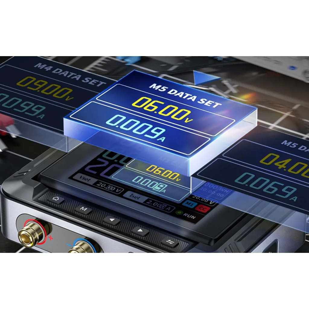 Kényelmes működés: A beépített 2,8 hüvelykes színes IPS képernyő nagy felbontást és elforgathatóságot kínál. Valós időben mutatja a feszültség-, áram-, teljesítmény-, hőmérséklet- és energiaszámlálókat. A DPS150 akár 6 előre beállított feszültség- és árambeállítási profilt is elmenthet.