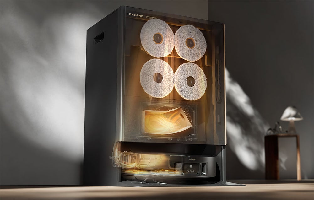 A ThermoHub™ rendszerrel felszerelt bázisállomás akár 100°C-os hőmérsékletű forró vízzel tisztítja a felmosó párnákat. A folyamat több lépésben zajlik - először egy fűtőelem emeli a víz hőmérsékletét, majd húsz fúvóka permetezi a párnákat, amelyeket egy speciális reszelőn gyors forgásban alaposan megtisztít. Végül a szennyeződéseket egy további szívónyíláson keresztül távolítják el, és az egész higiénikusan tiszta marad. Fontos, hogy a rendszer a tisztítás után automatikusan csökkenti a hőmérsékletet, így az állomás biztonságos marad a gyermekek és a háziállatok számára, minimálisra csökkentve az égési sérülések kockázatát.