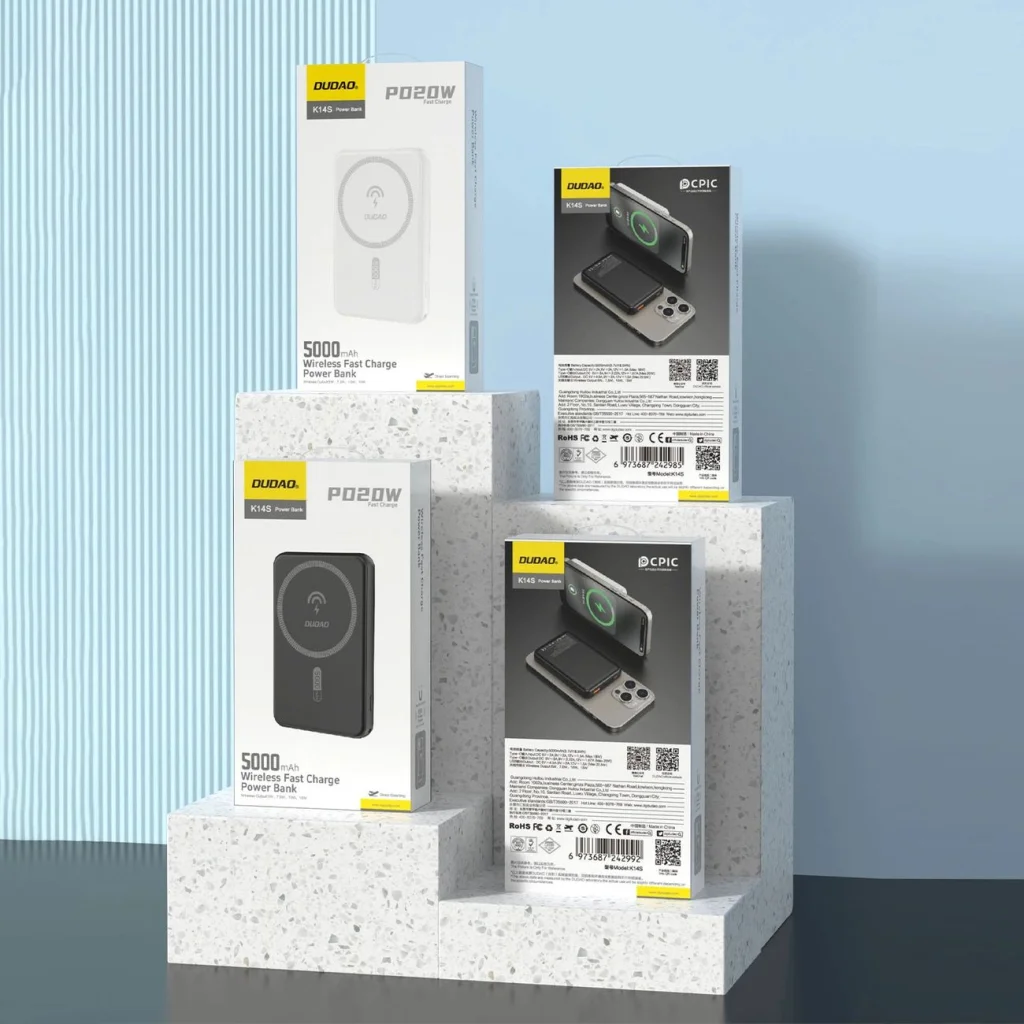 15W-os indukciós töltés, kompatibilis a MagSafe-fel Az akár 15W teljesítményű indukciós töltéstechnológia gyors és hatékony töltést biztosít kábelek használata nélkül. A MagSafe kompatibilitás azt jelenti, hogy Apple eszközeid biztonságosan és stabilan csatlakoznak a powerbankhoz, kiküszöbölve az elmozdulás és a töltés megszakadásának kockázatát. Akár három eszköz egyidejű töltése A Dudao K14S powerbank USB-A, USB-C és indukciós portokkal van felszerelve, amelyek lehetővé teszik három különböző eszköz egyidejű töltését. Legyen szó telefonról, tabletr