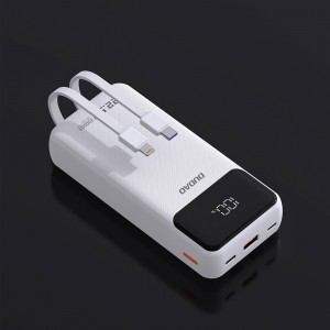 Dudao K15Pro powerbank 20000 mAh kapacitással és 22.5W teljesítménnyel, USB-C / USB-A portokkal és beépített Lightning és USB-C kábelekkel - fehér Többé nem kell aggódnia a készülékei energiahiánya miatt. A Dudao K15Pro powerbank, 20,000 mAh kapacitásának köszönhetően, számos töltési ciklust biztosít Önnek. A beépített Lightning és USB-C kábelek lehetővé teszik, hogy elfelejtse a mobil tartozékok hurcolásával járó problémákat. A powerbank támogatja a 22.5W PD gyors töltést, ami azt jelenti, hogy készülékei egy szempillantás alatt készen állnak a használatra. Ezenkívül az LED kijelzőnek köszönhetően mindig tudni fogja, mennyi energia maradt. Műszaki adatok: