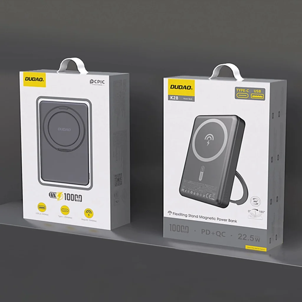 Ha egy megbízható, stílusos és sokoldalú powerbankra van szükséged, amely lépést tart a modern technológia igényeivel, a Dudao K28 tökéletes választás. Hordozható kialakításának, erős mágneses tartásának és többfunkciós állványának köszönhetően ideális útitárs a mindennapi ingázáshoz, utazáshoz vagy otthoni használathoz. Biztosíts folyamatos energiát eszközeidnek a Dudao K28 powerbankkal!