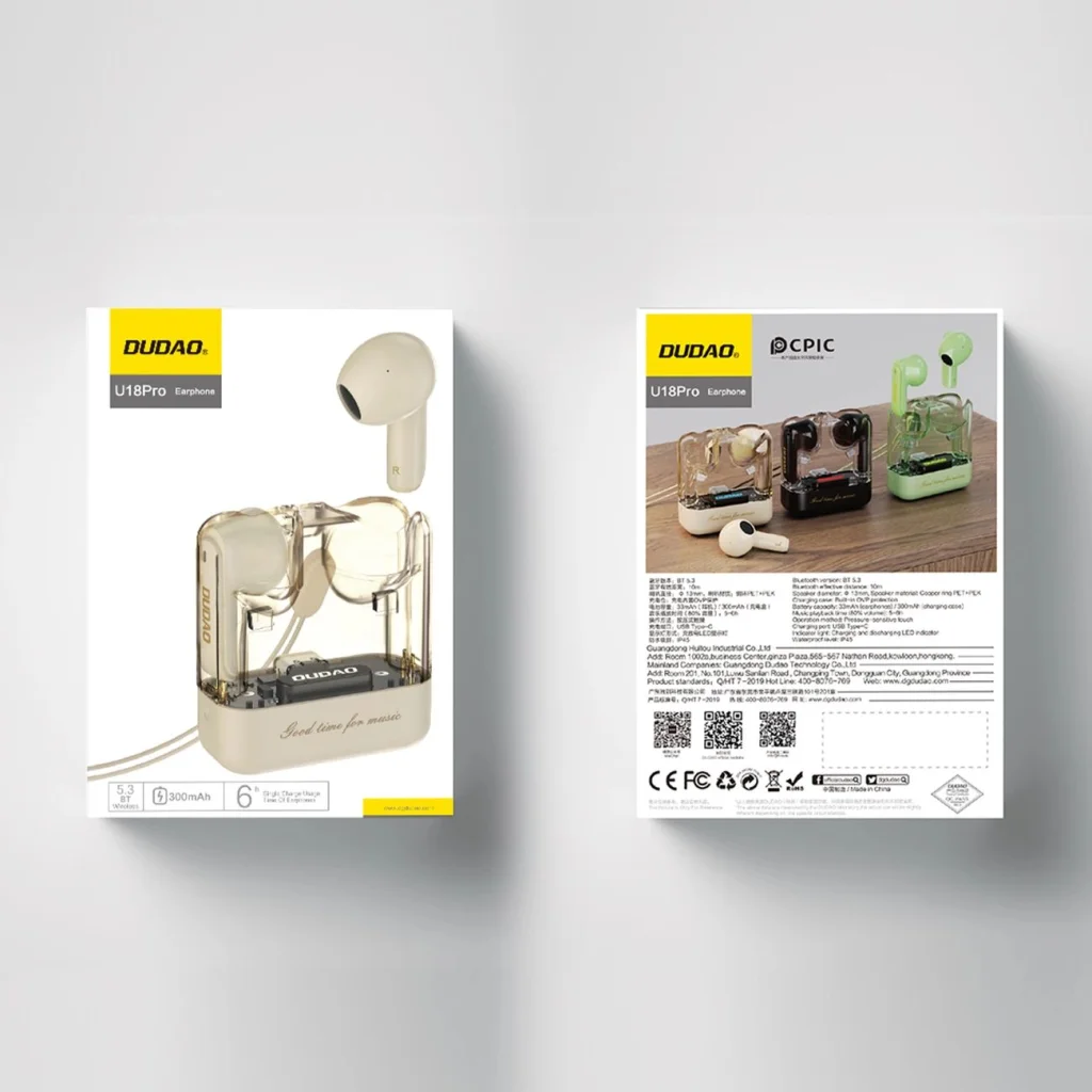 Dudao U18Pro Bluetooth 5.3 TWS vezeték nélküli fülhallgató - bézs Fedezze fel a kiváló hangzás új dimenzióját a Dudao U18Pro-val – Bluetooth fülhallgatókkal, amelyek egyedi dizájnukkal nyűgöznek le. Emellett a legújabb Bluetooth 5.3 technológia és a nagy kapacitású akkumulátor mobilissá és funkcionálissá teszi őket. Tudja meg, miért a Dudao U18Pro a tökéletes választás az igényes felhasználóknak. A Dudao U18Pro legfontosabb előnyei: