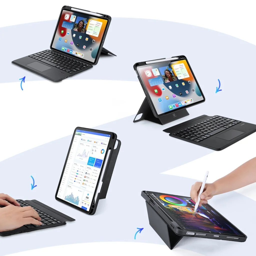 - Négy állványpozíció: Állítsd be az iPad dőlésszögét a saját igényeid szerint négy különböző állványpozícióval, amelyek lehetővé teszik a képernyő optimális kihasználását és növelik a felhasználói kényelmet.