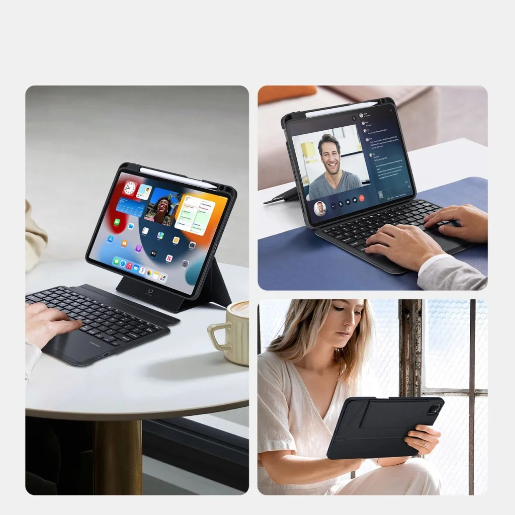 Dux Ducis DK Series Bluetooth billentyűzetes fliptok Apple iPad Air 4/5/iPad Pro 11 (2018/2020/2021/2022) - Fekete Bemutatkozik a forradalmi Dux Ducis billentyűzet (DK Series) Apple iPad Air 4/5/iPad Pro 11 (2018/2020/2021/2022) készülékekhez elegáns fekete színben! Ez a billentyűzet nemcsak megkönnyíti a feladatokat, hanem hihetetlen kényelmet és sokoldalúságot kínál az iPad használatakor. Merülj bele a Dux Ducis termékek új dimenziójába, és fedezd fel az új lehetőségeket, amelyeket ez a billentyűzet nyújt. Ne maradj le - szerezd be a legújabb Dux Ducis billentyűzetet még ma, és hangsúlyozd az iPad stílusát, miközben növeled a hatékonyságodat!