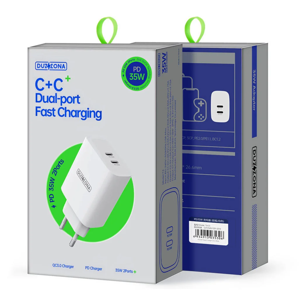 DUZZONA T4 hálózati töltő GaN technológiával. A kompakt és könnyű T4 töltő akár 35 W töltési teljesítményt kínál 2 kimeneti aljzaton. Számos gyorstöltési szabvány támogatása teszi ezt a töltőt ideálissá számos alkalmazáshoz.