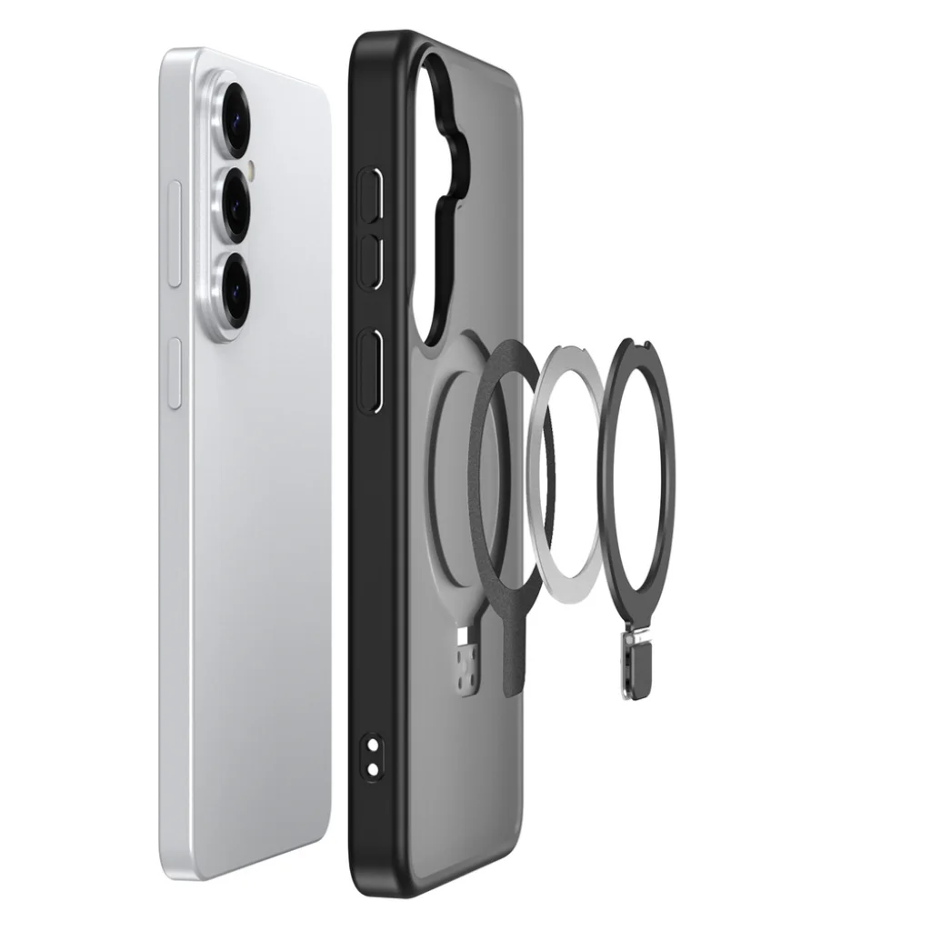 The Dux Ducis Yind is an elegant and durable case designed with the protection and comfort of Samsung S26+ in mind. It combines a matte PC polycarbonate back panel with a soft TPU frame, offering a secure grip and resistance to scratches and fingerprints. Built-in 38 magnets ensure MagSafe compatibility, stable attachment of magnetic accessories, and a stand function. Air cushions in the four corners help effectively absorb shock and reduce the impact of drops. It's a thoughtful combination of durability, comfort, and modern design in a gray finish.