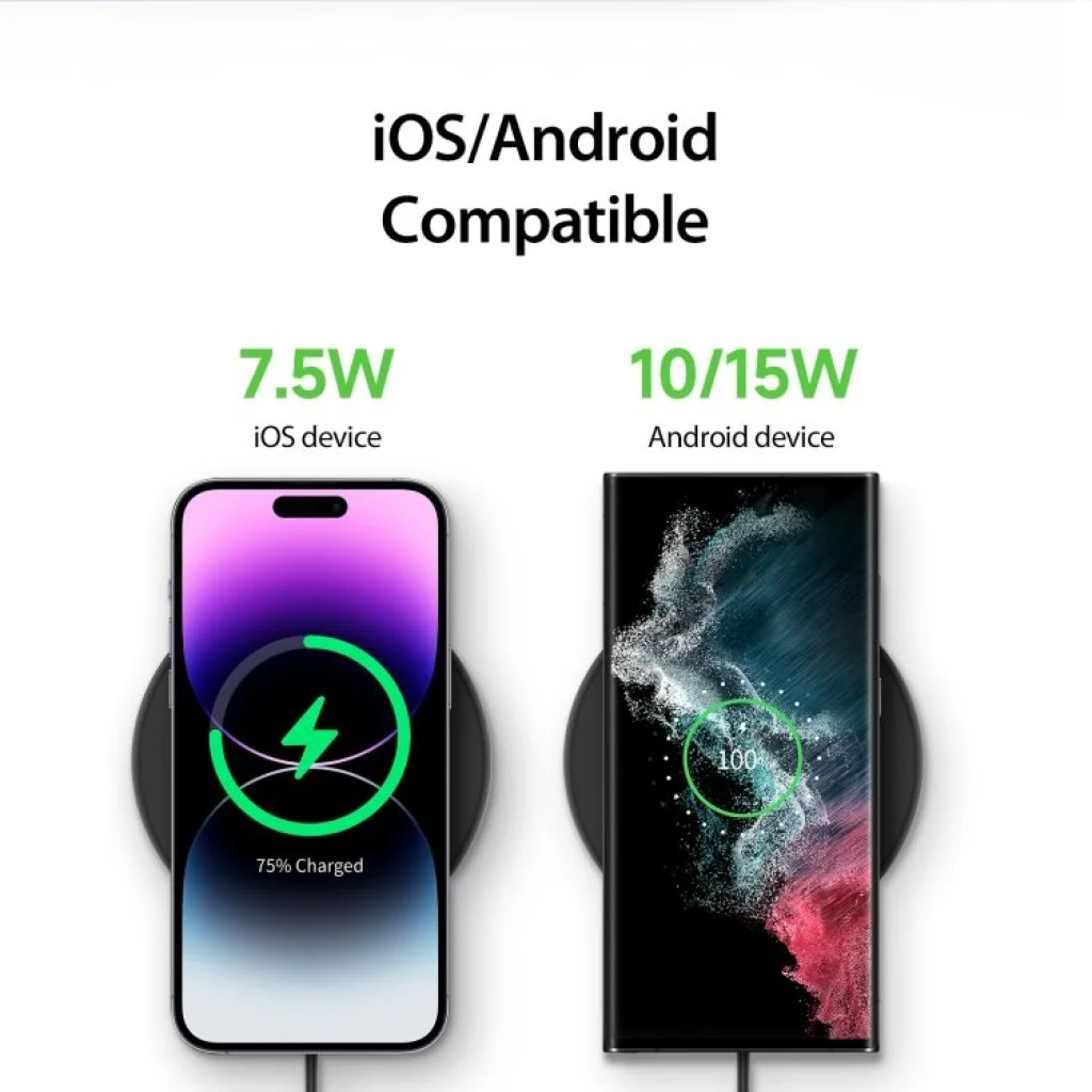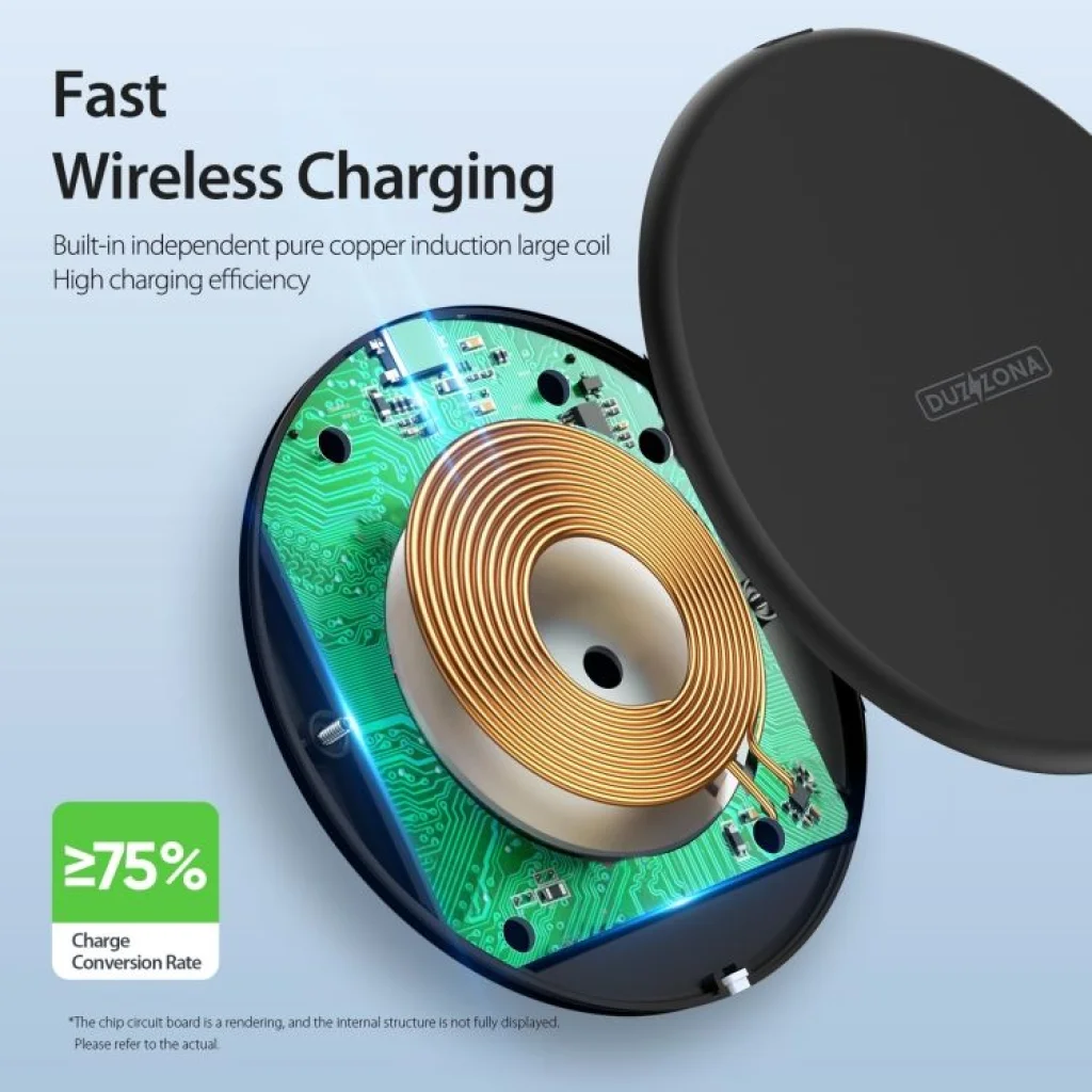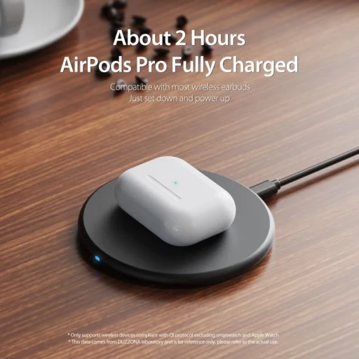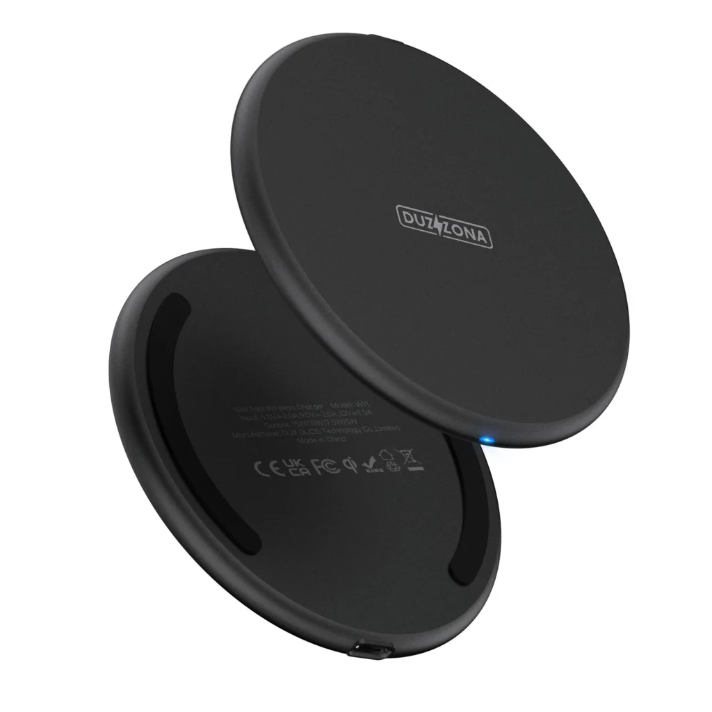 DUZZONA W11 gyors induktív töltő 15W teljesítménnyel, Qi tanúsítvánnyal. Ez a világ egyik legvékonyabb vezeték nélküli töltőinek új, továbbfejlesztett verziója. Minden Qi-kompatibilis okostelefonnal használható. Lehetővé teszi az AirPods töltését is. Sokoldalúság: A töltési teljesítmény akár 15W is lehet (a használt okostelefontól függően), amely gyorsan töltheti olyan telefonokat, mint a Xiaomi, Huawei és iPhone. Lehetőség van AirPods és tokban lévő telefon töltésére, ha a tok vastagsága nem haladja meg az 5 mm-t. Biztonság: A töltő rendelkezik egy töltőtekercsel, amely jelentősen felgyorsítja az egész folyamatot a töltési terület növelésével. Az intelligens vezérlőrendszer érzékeli a telefon paramétereit és hozzáigazítja a teljesítményt. Védelmet nyújt a rövidzárlat, a túltöltés, a túlmelegedés és a mélykisülés ellen. Qi tanúsítvánnyal rendelkezik. Kényelmes: A töltő vékony, csúszásmentes párnákkal ellátva, amelyek biztosítják a töltő stabilitását. LED jelzi az aktuális töltési állapotot. Műszaki adatok: Modell: DUZZONA W11 Teljesítmény: 5W / 7.5W (iPhone) / 10W / 15W Interfész: USB-C Kábel hossza: 1 m Kimeneti feszültség: DC 5V/ 2A 9V/2A 12V/1.5A Érzékelési távolság: <5mm Anyag: ABS Méretek: 100 x 100 x 8 mm Súly: 44 g Kompatibilitás: telefonok (Qi funkcióval rendelkező eszközök) / AirPods, AirPods Pro Egyéb: Qi tanúsítvánnyal rendelkezik