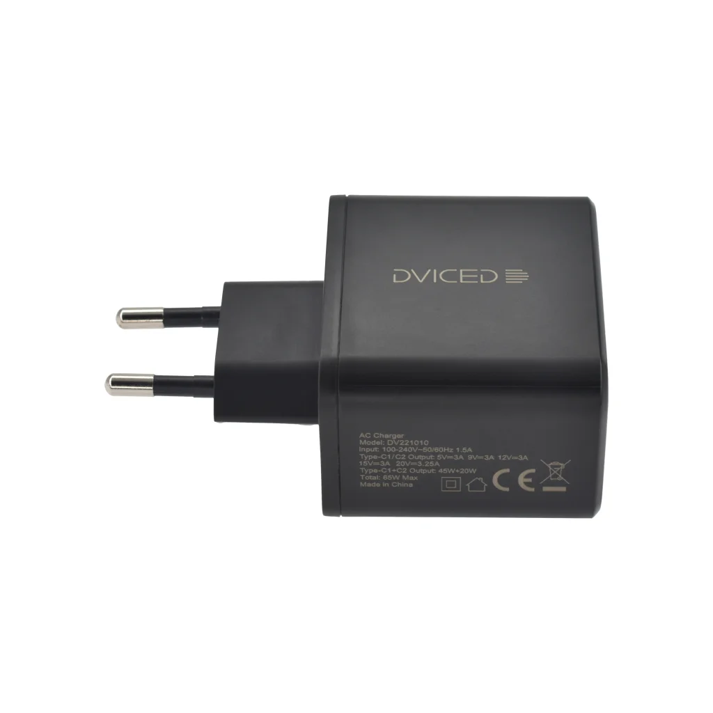 A Dviced fali töltő 65W GaN 2 USB-C EU - Fekete letisztult, elegáns fekete designja tökéletesen illeszkedik bármilyen modern környezetbe. Az EU szabványú csatlakozás és a rendkívül kompakt méret ideális útitárssá teszi. Tegye a táskájába, és felejtse el a nagy, nehéz adaptereket – ez a töltő nem fogja leterhelni, mégis gondoskodik róla, hogy soha ne merüljön le útközben.