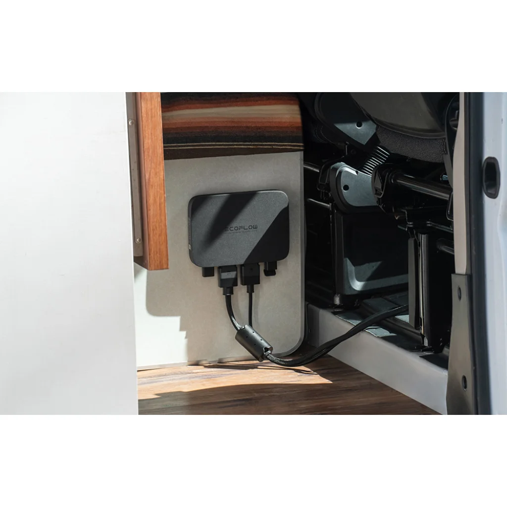 A terméket egyszerű telepítésre tervezték - a teljes telepítés három lépésben történik. A kompakt ház lehetővé teszi a készülék diszkrét elhelyezését a jármű belsejében. A vezetékek az akkumulátorhoz és a karosszéria földelésként funkcionáló fémrészéhez csatlakoznak. Vegye azonban figyelembe, hogy az XT60 kábel (az EcoFlow állomások szabványos csatlakozója) használata esetén manuálisan be kell kapcsolni a készüléket, és aktiválni kell a töltést az alkalmazásban - ezért célszerű elkerülni a nehezen hozzáférhető helyekre történő beszerelést.