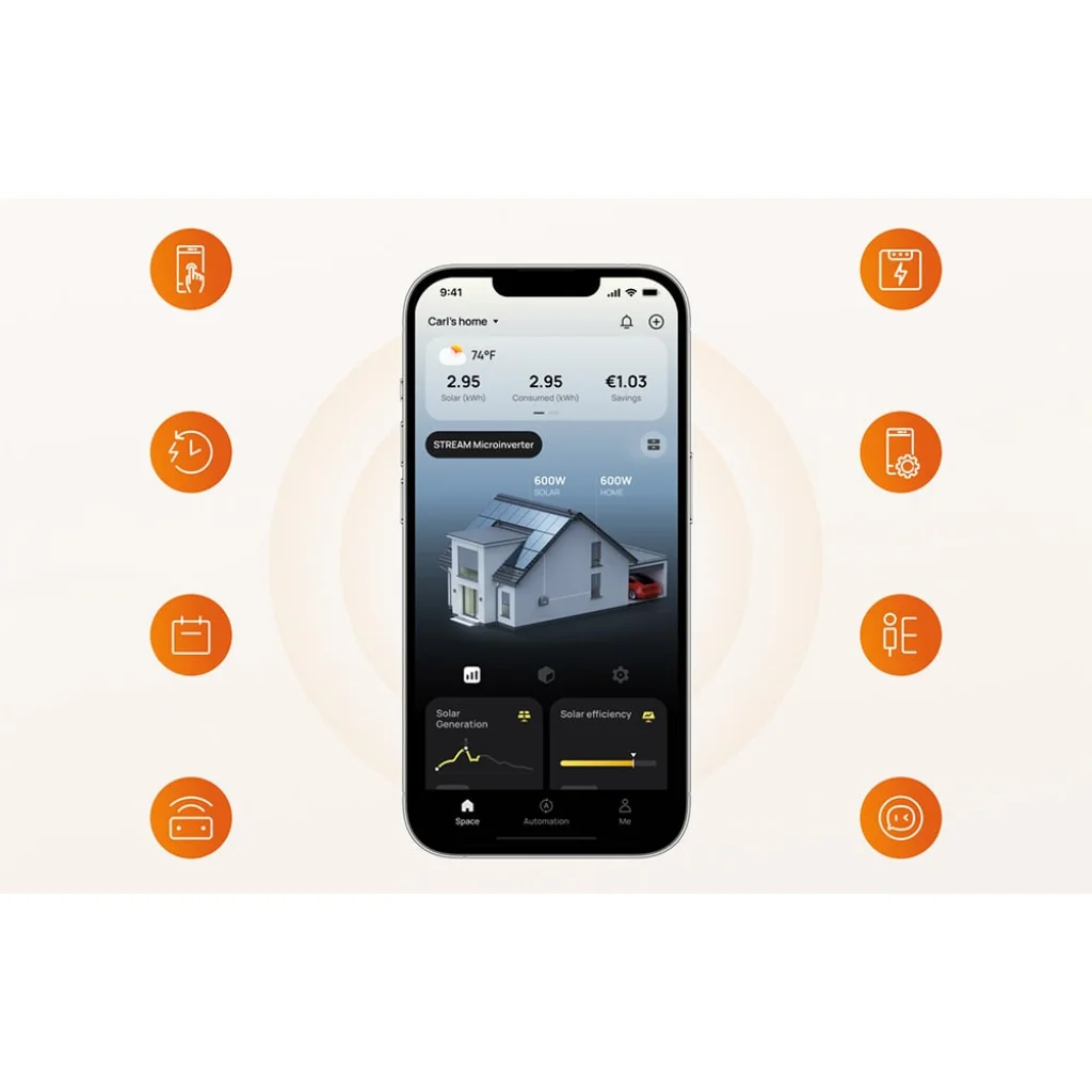 Az EcoFlow Stream 800W egy korszerű mikroinverter készlet, amely PV és AC kábeleket tartalmaz. Ez a mikroinverter a fotovoltaikus panelekből származó energiát maximálisan hatékonyan alakítja át, és két független MPPT-csatornát támogat, melyek mindegyike legfeljebb 600 watt bemeneti teljesítményt képes kezelni, összesen akár 1200 wattot is elérve. Akár 800 W kimeneti teljesítményt generál 3,48 A mellett, és ideális a hálózaton lévő rendszerekhez. Beépített Wi-Fi-vel és Bluetooth-szal rendelkezik, így teljes vezérlése az alkalmazásból elérhető. Az EcoFlow STREAM Plug & Play Solar részét képezi, ami egyszerű telepítést, intelligens energiagazdálkodást kínál, és megtakarítást eredményez anélkül, hogy villanyszerelőt hívnánk. A mikroinverter IP67-es védelmi osztállyal rendelkezik, -40°C és 65°C között üzemel, és csendes, mindössze 20 dB alatti zajszinttel működik. Kompakt méretei: 252 x 180 x 35 mm, 3,2 kg súlyú, a telepítés könnyű és nem igényel speciális eszközöket. Az alkalmazás lehetővé teszi a fogyasztási előrejelzések és AI-alapú funkciók elérését, valamint a távvezérlést.