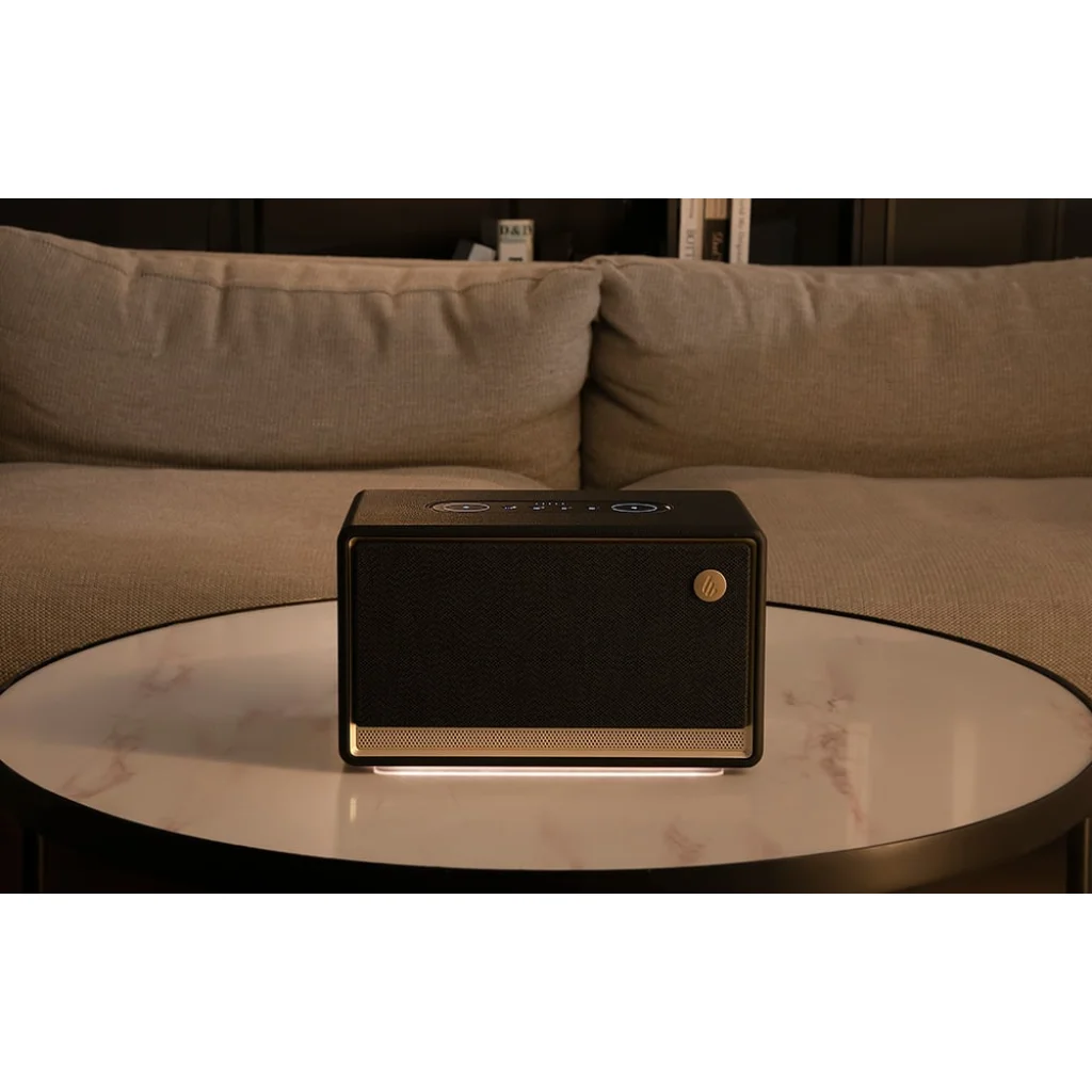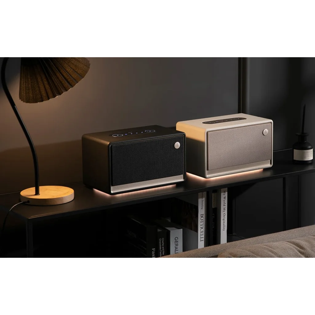 A retro stílusú, fából készült ház 15 mm vastag MDF lemezből készült. Ez nemcsak a rezonanciákat csökkenti, hanem időtlen stílust is kölcsönöz a hangszórónak. A hangszóró szövetborítása és minimalista részletei kiemelik a hangszóró elegáns jellegét. Emellett a három üzemmóddal rendelkező lágy Ambient Light háttérvilágítás lehetővé teszi, hogy bármilyen helyzethez - a pihenéstől a barátokkal való bulizásig - igazítsa a hangulatot.
