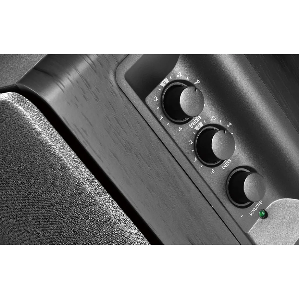Pontos vezérlés Személyre szabhatja hangélményét a basszus, a magas hangok és a hangerőszabályzó gombokkal. Az általuk előállított kiváló minőségű hangzás precíz, erőteljes középhangokat biztosít, amelyek minden kritikust elragadtatnak. Egy kompakt, praktikus távvezérlő tartozék. Az Edifier R1280T beépített hangszínszabályzóval rendelkezik a hangszóró oldalán. A preferenciáktól függően -6 és +6 dB között mikrobeállíthatja a magas- és mélyhangokat. A digitális hangerőszabályzó minden egyes alkalommal, amikor újra bekapcsolja a hangszórót, automatikusan kényelmes szintre áll be.