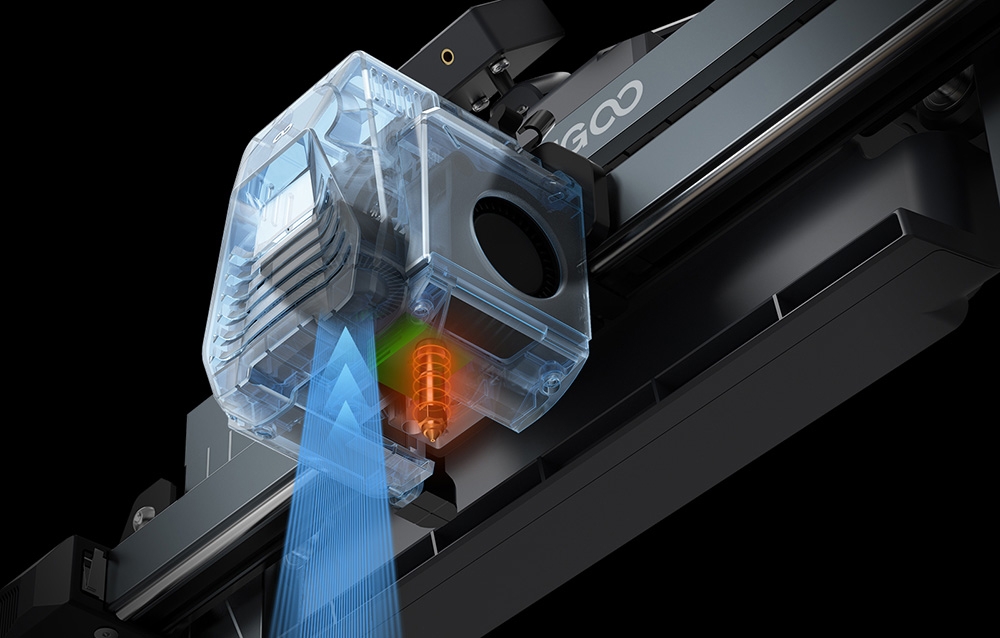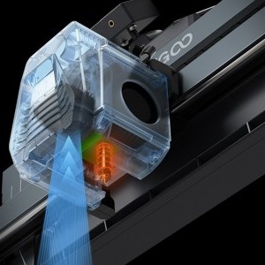 Továbbfejlesztett hotend és extruder: A nagy teljesítményű, kettős fogaskerék-elosztású, direkt típusú extruder precíz és stabil filament adagolást biztosít, míg a továbbfejlesztett hotend réz-titán hőcsövet és 300°C-os fúvókát alkalmaz.