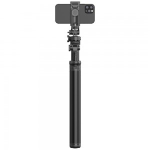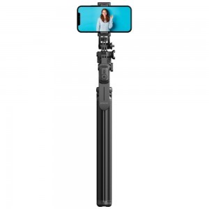 Az állvány Bluetooth távirányítóval van felszerelve, amely megkönnyíti a fényképek készítését és videók felvételét. Csak kapcsolja be az eszközt, csatlakoztassa az okostelefonjához, majd nyomja meg a megfelelő gombot a távirányítón a fénykép készítéséhez vagy a felvétel indításához.