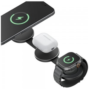 Összecsukható és hordozható dizájn: Az Alumag Trio töltő átgondolt kialakítása ideálissá teszi otthoni és utazási használatra egyaránt. Kompakt, összecsukható formájának köszönhetően könnyen tárolható és szállítható táskában vagy hátizsákban. Összecsukott állapotban a töltő minimális helyet foglal el (60 × 60 × 28 mm), és csak 132 g, ezáltal rendkívül praktikus mindennapi társ. Az iPhone Standby módnak és az Apple Watch Nightstand módnak köszönhetően stílusos éjjeliszekrény vagy asztali állványként is szolgálhat.