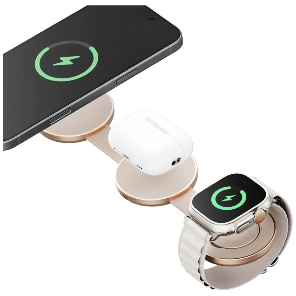 Az Energea Alumag Trio egy modern 3 az 1-ben vezeték nélküli töltő, amely a mindennapi kényelmet szolgálja. Lehetővé teszi három eszköz egyidejű töltését - egy okostelefon, Apple Watch és TWS fülhallgató - egy kompakt megoldásban. A Qi2 tanúsítványnak és a MagSafe kompatibilitásnak köszönhetően gyors, biztonságos és hatékony energiát biztosít maximum 15 W teljesítménnyel telefonjához. Tökéletes megoldás azok számára, akik értékelik a funkcionalitást, eleganciát és a rendezett munkaterületet felesleges kábelek nélkül.