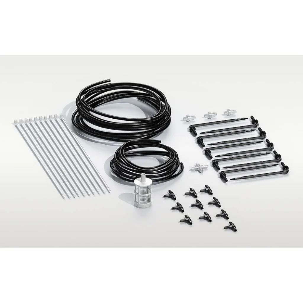 - Csepegtető szórófej (10 db): Precíz és víztakarékos csepegtetők, amelyek célzottan juttatják a vizet a növények gyökérzónájához, minimalizálva a párolgási veszteséget és elősegítve az optimális növekedést.