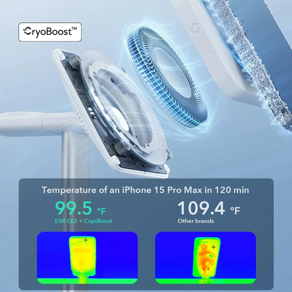 Tapasztalja meg a hihetetlen sebességet! Az ESR Qi2 és CryoBoost kombinációja lehetővé teszi, hogy egy iPhone 15 Pro Max készüléket mindössze 2 óra alatt teljesen feltöltsön, szemben más márkák 3 órás átlagával. A CryoBoost aktív hűtése stabilan tartja a készülék hőmérsékletét (mindössze 37.5 °C / 99.5 °F 120 perc után), megakadályozva a túlmelegedést, ami hozzájárul az akkumulátor hosszú távú élettartamának megőrzéséhez és a töltési sebesség fenntartásához.