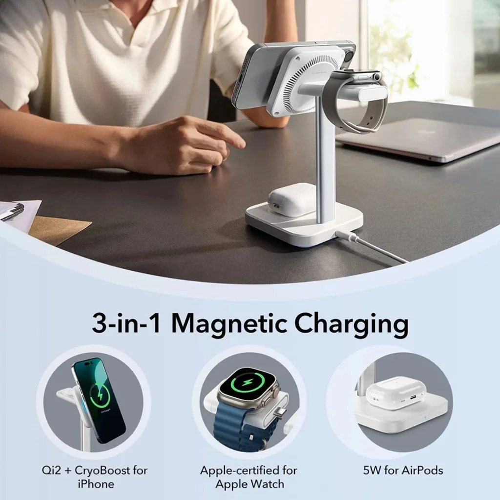 Az ESR CryoBoost 3-az-1-ben Vezeték Nélküli Töltőállomás egy prémium megoldás arra, hogy egyszerre és hatékonyan tölthesse fel Apple eszközeit. A fekete színű, elegáns kialakítású töltőállomás az asztal dísze lesz, miközben a legmodernebb technológiával biztosítja a gyors és biztonságos energiaellátást iPhone-jának, Apple Watch-ának és AirPods-ának.