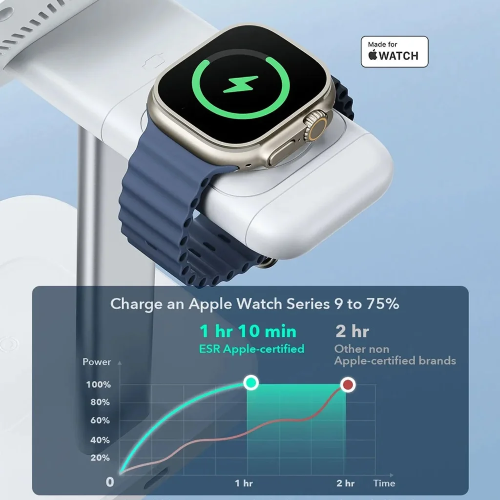 A "Made for Watch" tanúsítvány garantálja a maximális kompatibilitást és a gyors töltést. Egy Apple Watch Series 9 készüléket mindössze 1 óra 10 perc alatt 75%-ra tölthet fel, ami jelentősen gyorsabb, mint a nem tanúsított töltők 2 órás teljesítménye. A levehető óratöltő modul rugalmasságot biztosít, így akár utazáshoz is magával viheti.