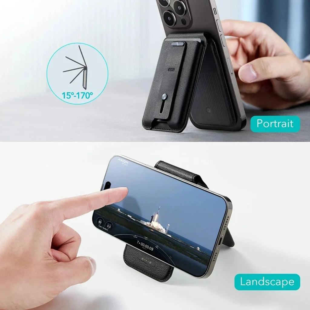Az ESR Geo mágneses pénztárca és állvány egy többfunkciós, prémium kategóriás kiegészítő, amely forradalmasítja az okostelefon-használatot. Az elegáns, fekete vegán bőrből készült termék tökéletesen ötvözi a kártyatartó, az asztali állvány, a biztonságos telefontartó ujjhurok és az okos nyomkövető funkcióit.