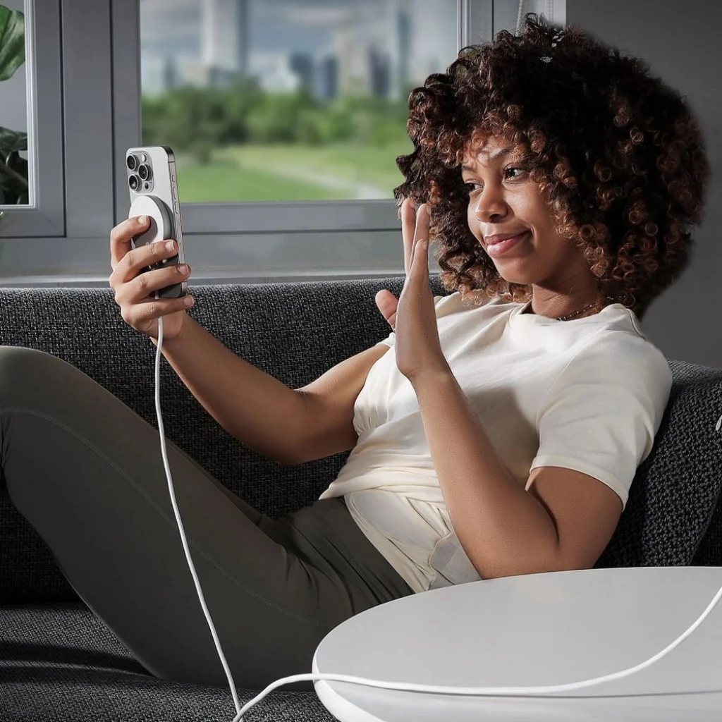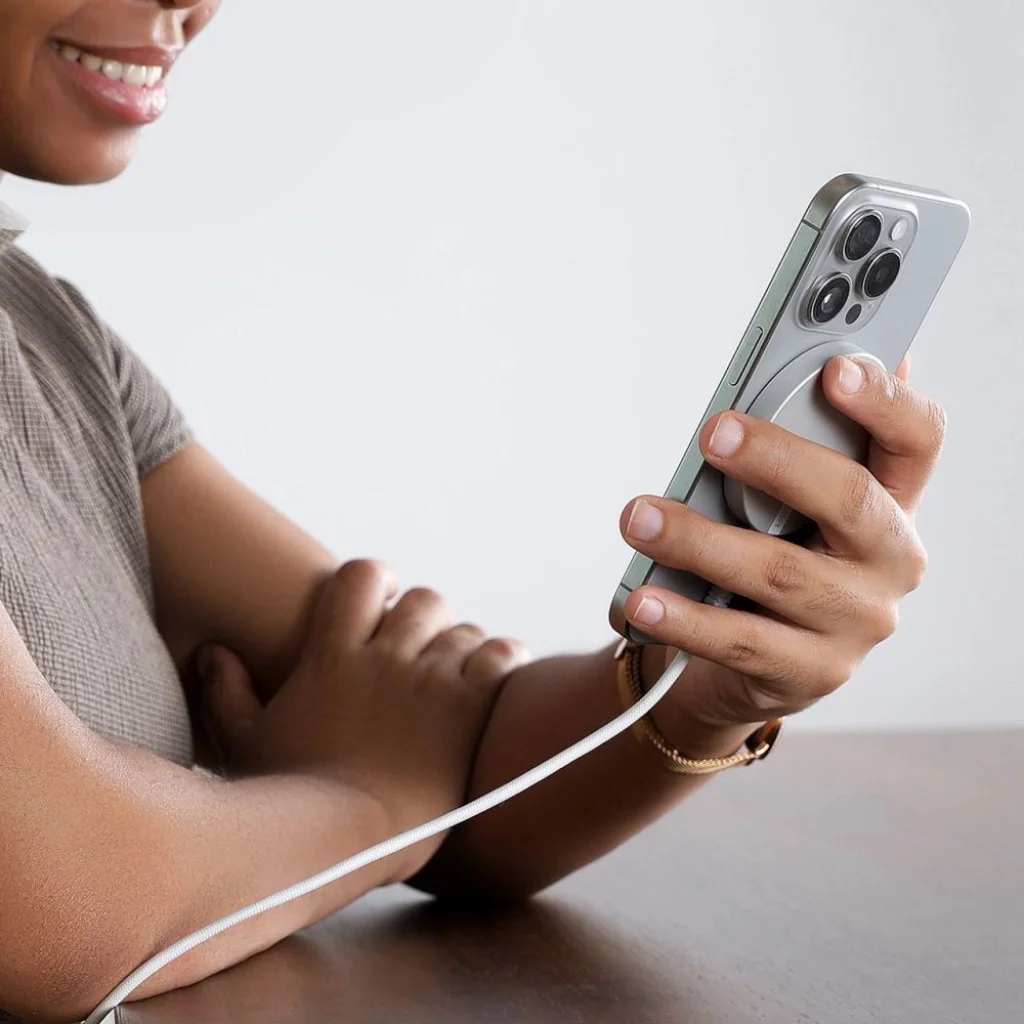 Az ESR HaloLock Qi2 Mini egy modern töltő, amely fejlett funkciókkal van felszerelve, biztosítva a telefon kényelmes és biztonságos töltését. Az erős mágnesek szilárd kapcsolatot hoznak létre a telefonnal, ami gyorsabb és megbízhatóbb töltést eredményez, még a készülék használata közben is. A HaloLock Qi2 Mini a fejlett hőelvezetési kialakításának köszönhetően gyorsabban tölti a telefont, mint más MagSafe töltők, így maximális töltési sebességet biztosít. A kábel megerősített alappal és fonott nylon külső burkolattal van ellátva, hogy megőrizze újszerű megjelenését és teljes funkcionalitását. Emellett az extra hosszúságú (1,5 m) kábel lehetővé teszi, hogy játszhass, beszélhess, böngészhess az interneten és szabadon mozoghass a telefon töltése közben. Az ultra vékony és kompakt kialakítás révén a töltő könnyen elfér a zsebedben vagy táskádban, így lehetővé téve a kényelmes, gyors töltést útközben. A töltő teljes védelmi funkciókkal rendelkezik, beleértve az idegen tárgyak észlelését, a túlmelegedésvédelmet és a túlfeszültségvédelmet, hogy biztosítsa okostelefonod biztonságát. A töltőnek nincs indikátor fénye. A képen látható zöld háttérvilágítás csak a QI2 technológia bemutatására szolgál.