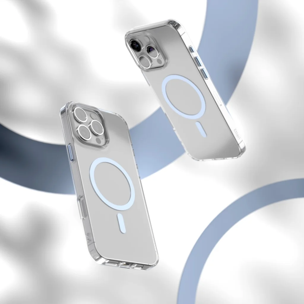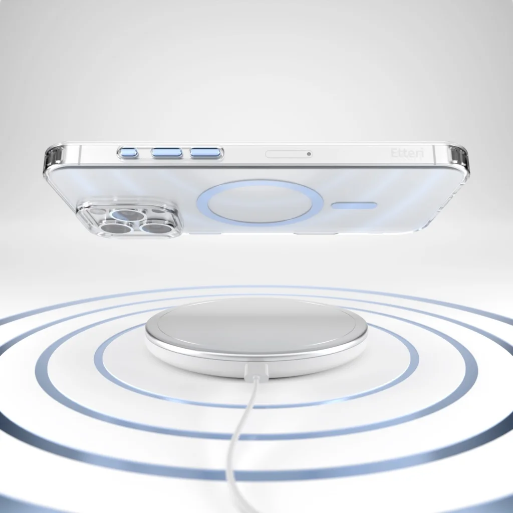 Az Etteri Color Mag tok két anyagból készült: rugalmas, formázott TPU szélek és egy merev PC hátlap. Ez a kombináció biztosítja a tökéletes illeszkedést az eszköz számára, és biztonságos fogást nyújt. Az átlátszó hátlap nem takarja el a telefon dizájnját, kiemelve annak eredeti esztétikáját. Fém gombok és színben illeszkedő akcentus egyedi karaktert adnak.