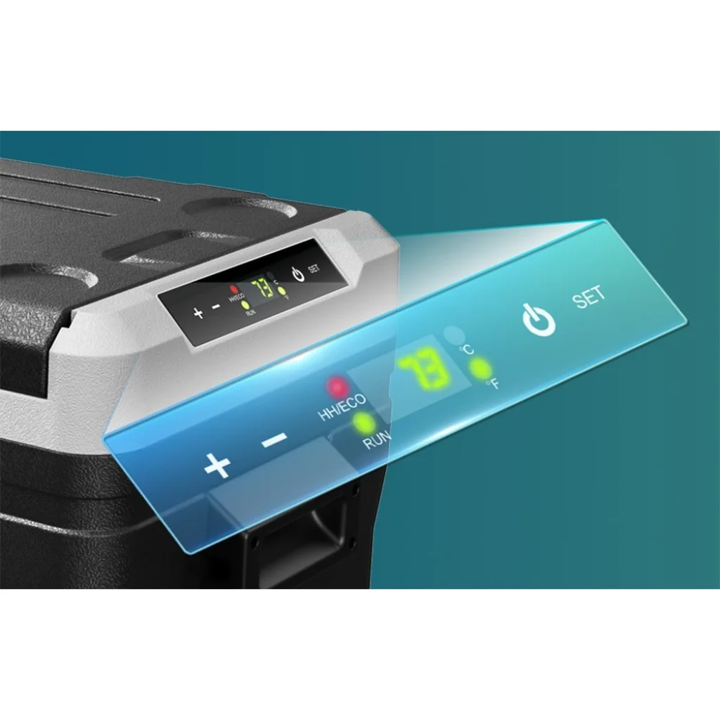 Az érintőképernyős kezelőpanel lehetővé teszi a hőmérséklet változtatását, az üzemmód beállítását és a működés valós idejű ellenőrzését. Emellett a külön erre a célra kifejlesztett alkalmazásnak köszönhetően okostelefonjáról is vezérelheti a készüléket - ez különösen kényelmes, ha a hűtőszekrényt egy jármű hátsó részében vagy egy sátorban helyezi el.