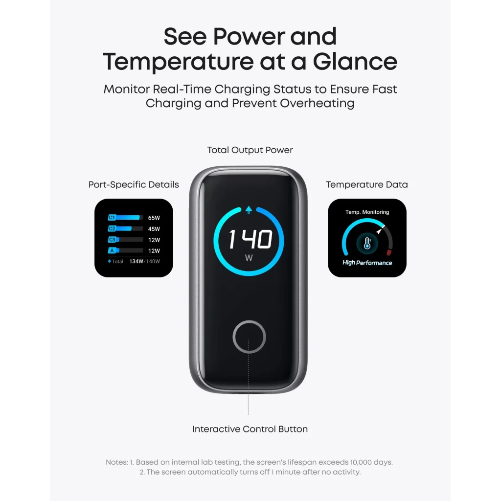 - Intelligens és valós idejű biztonság ActiveShield 4.0-val: Az Anker továbbfejlesztett ActiveShield 4.0 technológiája folyamatosan, több mint 10 millió alkalommal naponta figyeli a hőmérsékletet, valós idejű, 24 órás védelmet nyújtva a túlmelegedés, túlfeszültség és rövidzárlat ellen. A töltőbe integrált, intuitív érintőkijelzőn azonnal nyomon követheti az összesített töltési teljesítményt, az egyes portok pillanatnyi watt leadását (pl. C1: 65W, C2: 45W, C3: 12W, A: 12W), valamint a készülék hőmérsékletét, így mindig pontosan tudja, mi történik. Az interaktív vezérlőgombbal könnyedén kezelheti a kijelzőt, mely 10 000 napnál is hosszabb élettartammal rendelkezik, és 1 perc inaktivitás után automatikusan kikapcsol.