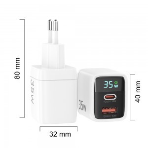 • Kettős port kialakítás: Tölthet egyszerre két eszközt az USB-C (PD3.0) és az USB-A (QC3.0) porton keresztül. Az USB-C port önmagában akár 35W-ot, az USB-A port önmagában akár 30W-ot is képes biztosítani. Az együttes maximális kimeneti teljesítmény megosztva 35W.
