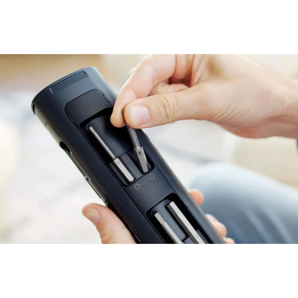 A beépített mágnestartóval ellátott, stabil alumínium tokban a csavarhúzó és a bitek könnyen tárolhatók. A kihúzható mechanizmus gyors hozzáférést biztosít, a markolat és a bitek mágnesezettsége pedig megkönnyíti a biztonságos tartást.