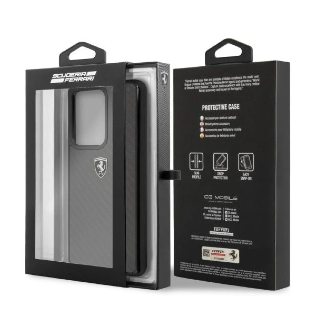 A Heritage Carbon széria időtlen eleganciája valódi szénszálból készült, amelyet Forma 1-es autókban és golyóálló mellényekben használnak. Az extrém tartósságú tokok rendelkeznek a telefon funkciógombjaihoz szükséges kivágásokkal, lehetővé téve, hogy szabadon használhassa készülékét. Kivételes gondossággal készült, háromdimenziós szénstruktúráját a Ferrari fém logója díszíti. Kollekció: Heritage Típus: Kemény tok Anyag: Szénszál Szín: Fekete Kompatibilitás: Samsung Galaxy S20 Ultra G988. Ferrari licensz alapján gyártott termék.