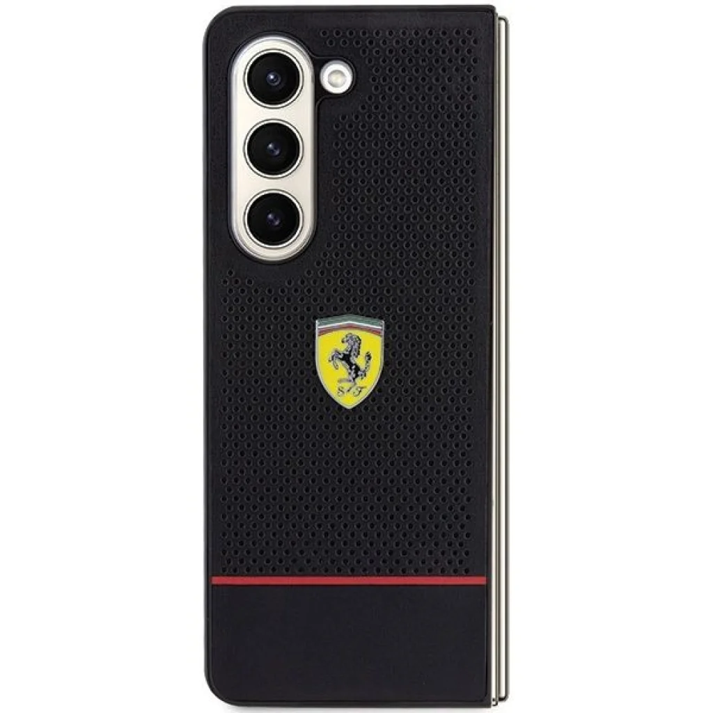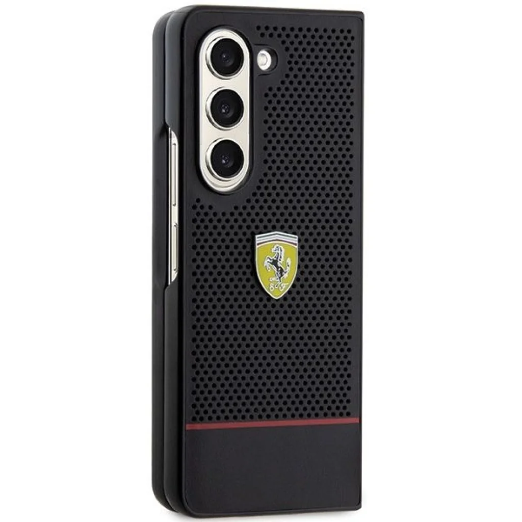 A Ferrari tokot perforált ökológiai bőr különbözteti meg, amely figyelemfelkeltővé és nagyon jellegzetessé teszi a tokot. Az egyes tokokat díszítő központi elem egy nagy fém logó az olasz autóipari óriástól - ez egyértelmű utalás a Ferrari sportörökségére és a vele járó presztízsre, valamint megerősíti a termék magas minőségét és luxus jellegét. Ez a kollekció egy keskeny, vízszintes piros csíkkal van kiegészítve - ami csodálatosan kontrasztál a tok klasszikus fekete színével.