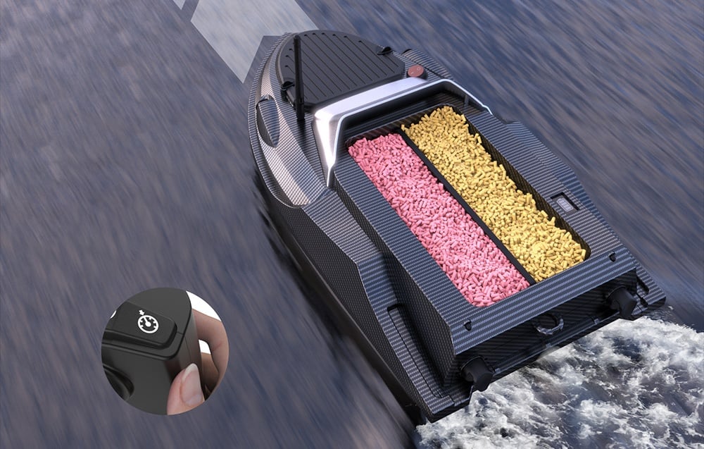 Töltsön akár 3 kg alapcsalit két független kamrába, és táplálkozzon különböző keverékekkel egy kiránduláson. A kiöntési funkció távirányítású, így teljes mértékben Ön irányíthatja, hogy hova és mennyi csalit öntsön ki.